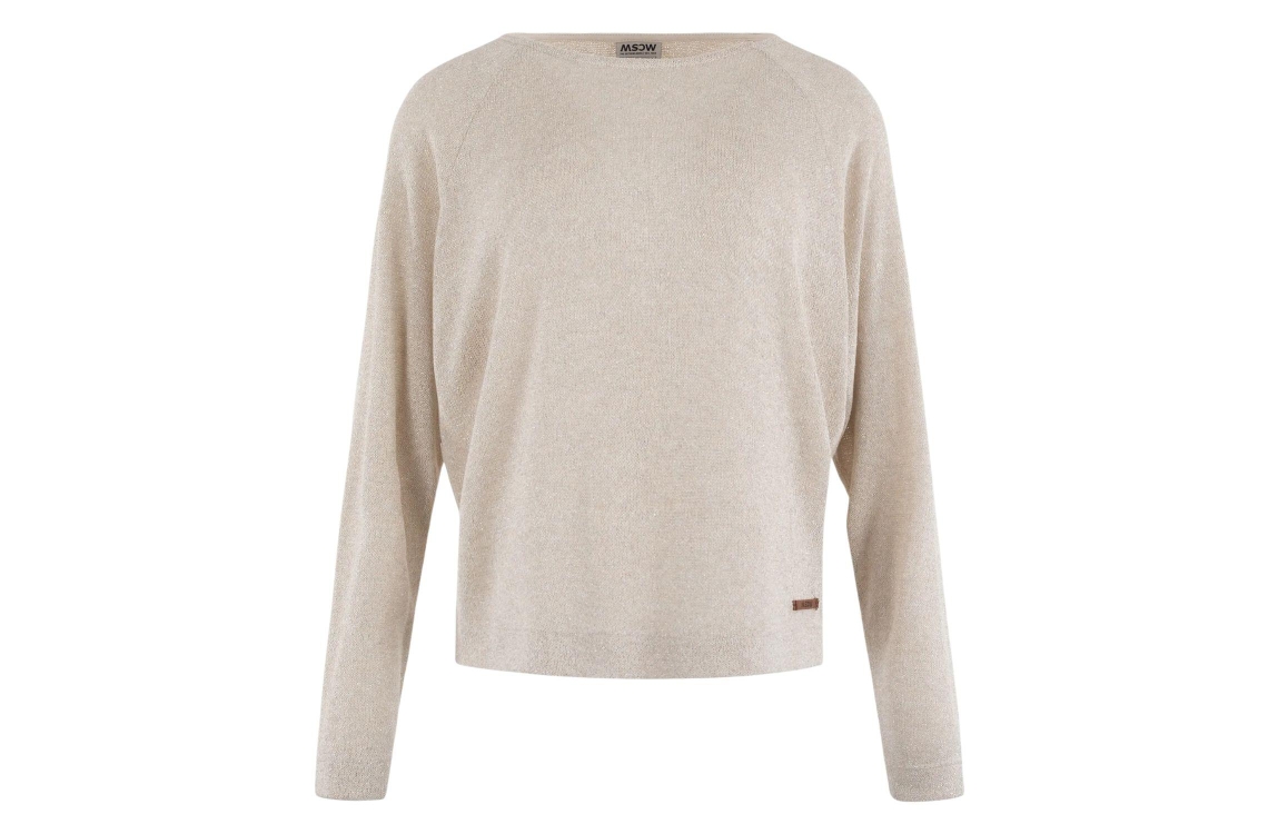 Moscow 45-04-Rianne-1 330-1Kit solid. Dit rechtvallende model is voorzien van een wijde halslijn en heeft lange mouwen. Deze beige top van Moscow is bewerkt met een subtiele glans en een schuine mouwinzet.