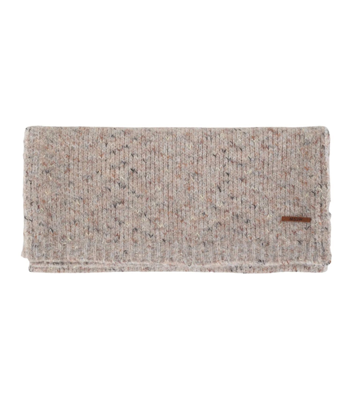 Moscow sjaal 49-12. Deze taupe, langwerpige sjaal van Moscow is uitgevoerd in een gebreide, gemêleerde structuur en is afgewerkt met het logo-embleem.