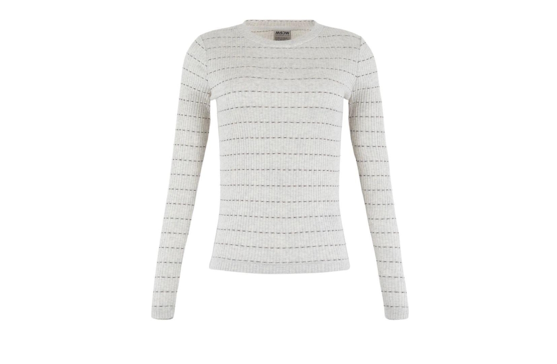 Moscow top 54-04. Dit rechtvallende model his voorzien van een ronde hals en heeft lange mouwen. Deze grijze top van Moscow is bewerkt met strepen horizontaal afgewerkt met een glittertje en beschikt over het logo-embleem aan de voorzijde.