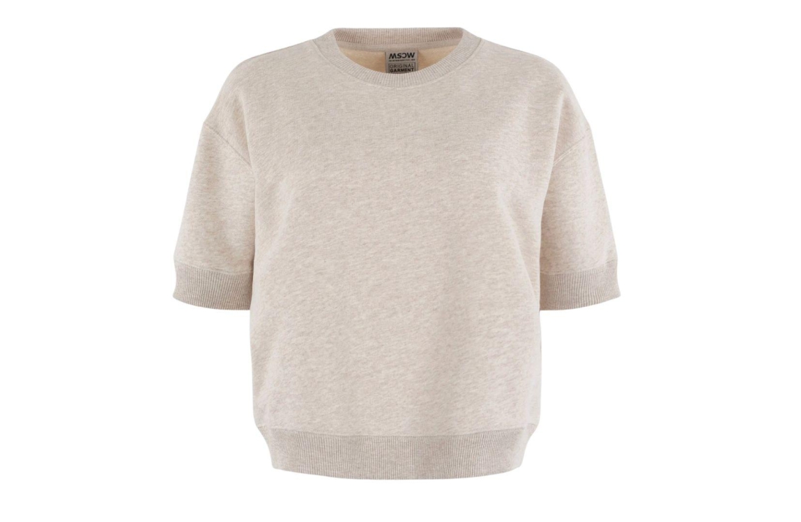 Moscow sweater 57-04 Noe 320-1. Dit boxy fit model heeft een ronde halslijn en korte mouwen. Deze creamkleurige sweater van Moscow is gedetailleerd met het bruinkleurige merkembleem op de achterzijde en is afgewerkt met ribgebreide boorden.