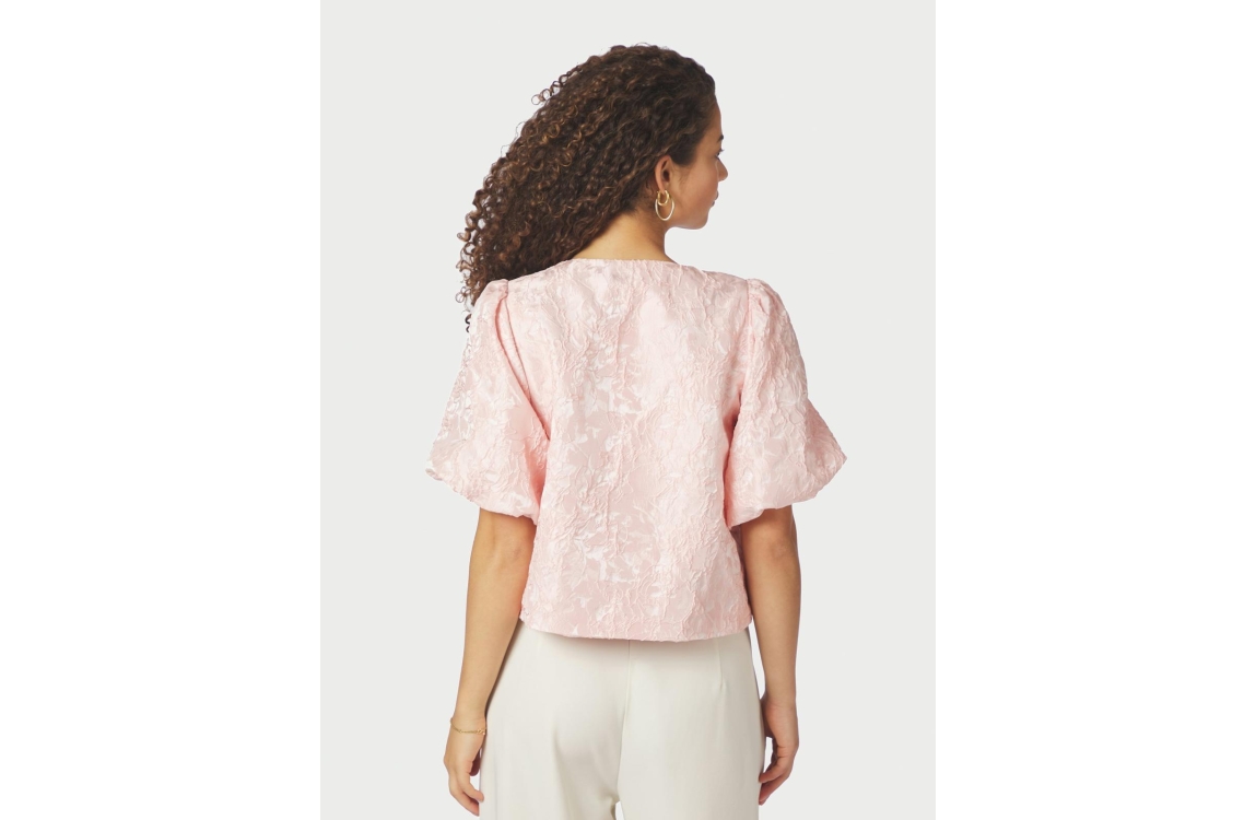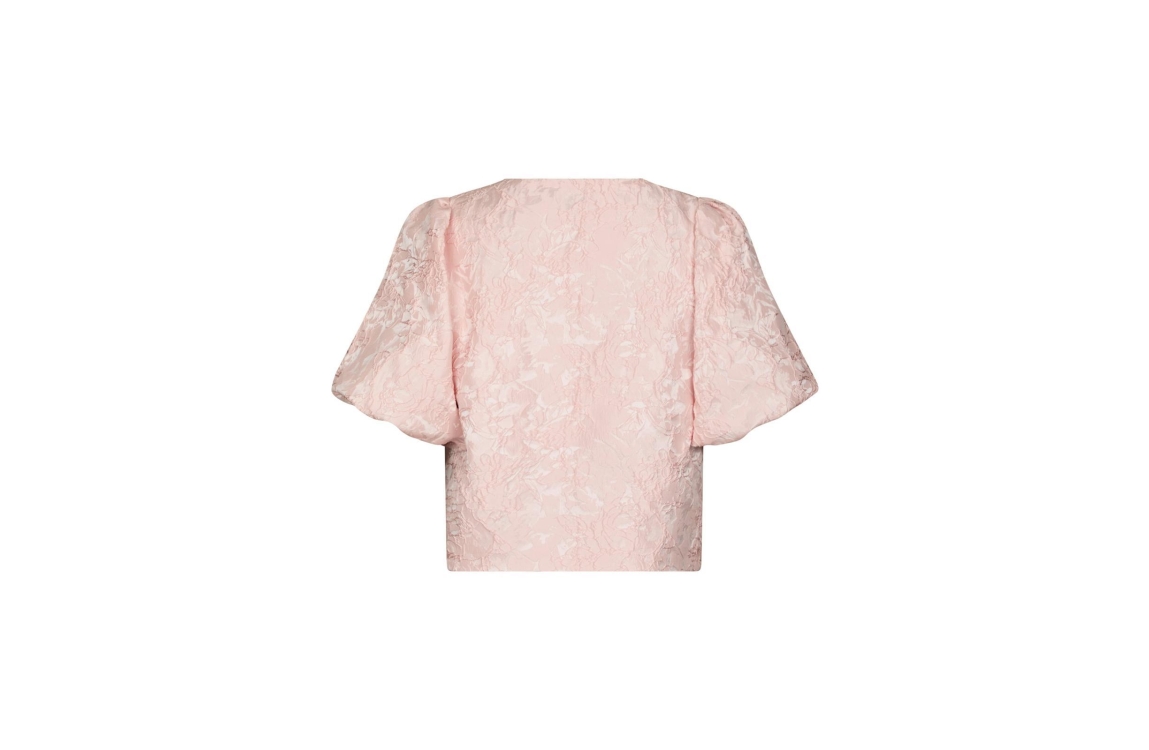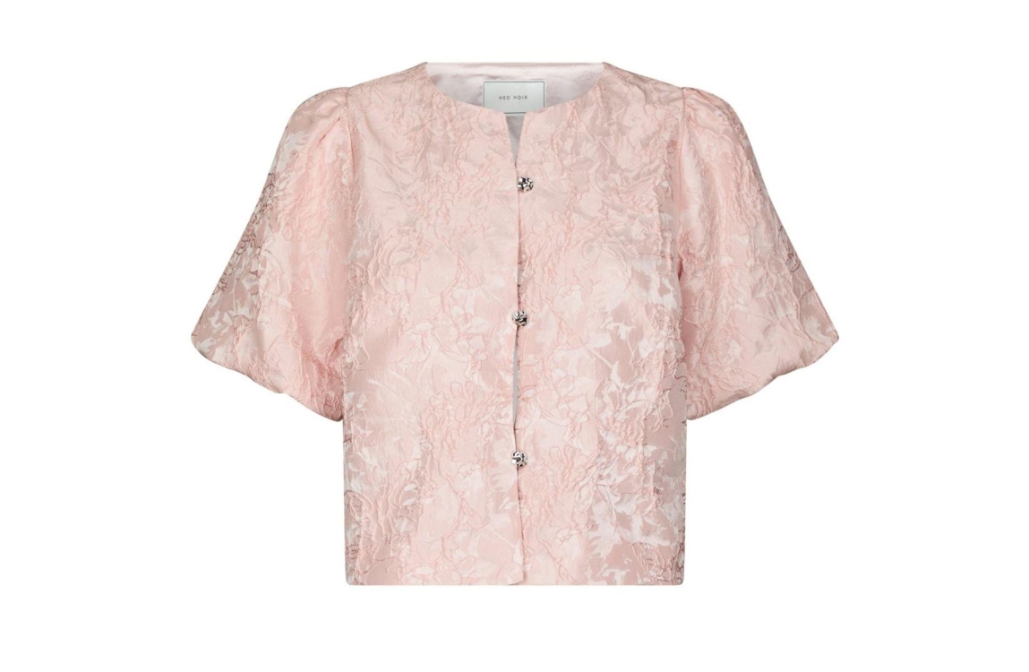Neo Noir Aisa Soft Brocade Blouse Light pink. Dit rechtvallende model is voorzien van een ronde hals en heeft korte pofmouwen. Deze roze blouse van Neo Noir sluit aan de voorzijde door middel van zilverkleurige knopen. Dit model is all-over bewerkt met een bloemenprint en structuur.