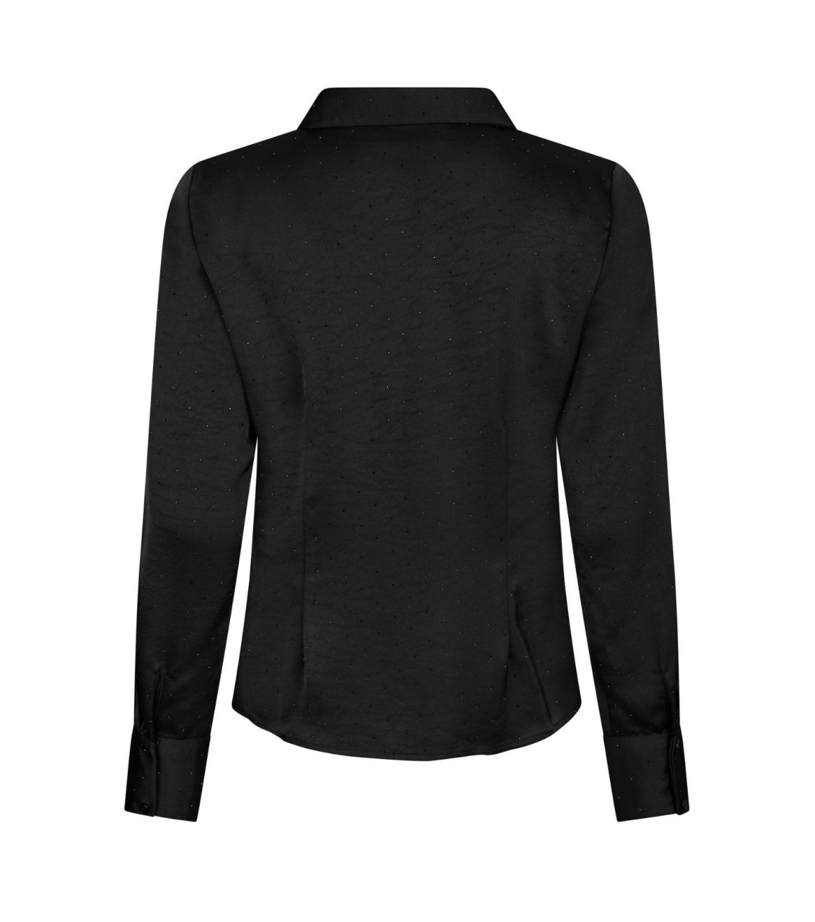Neo Noir Christy heavy sateen bedaz shirt 100 Black. Dit aangesloten model is voorzien van een V-hals, een kraag en heeft lange mouwen. Deze zwarte blouse van Neo Noir sluit door middel van knopen. Dit model is aan de voorzijde gedrapeerd en is allover bewerkt met zwarte steentjes.