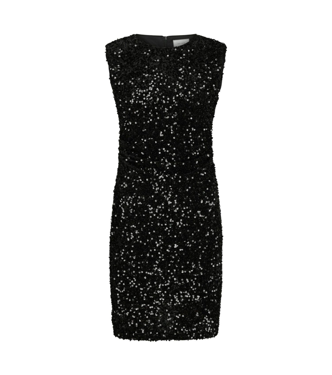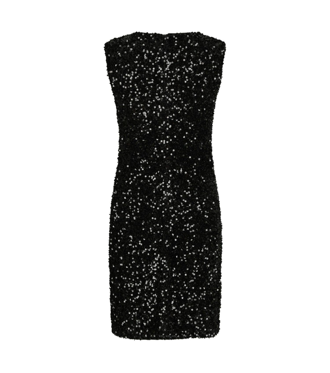 Neo Noir Fanya velvet sequins dress 100 Black. Dit aangesloten model heeft een ronde hals en is mouwloos. Deze zwarte jurk van Neo Noir is bewerkt met all-over pailetten en beschikt over een binnenjurk. Dit model sluit door middel van een rits op de achterzijde.