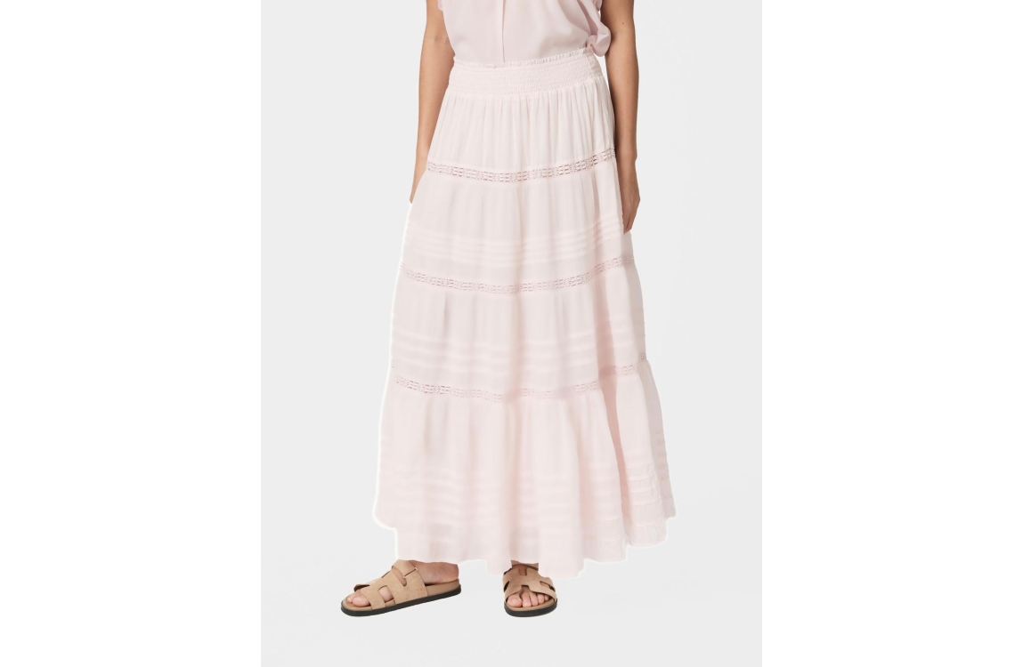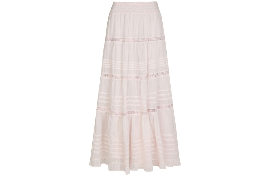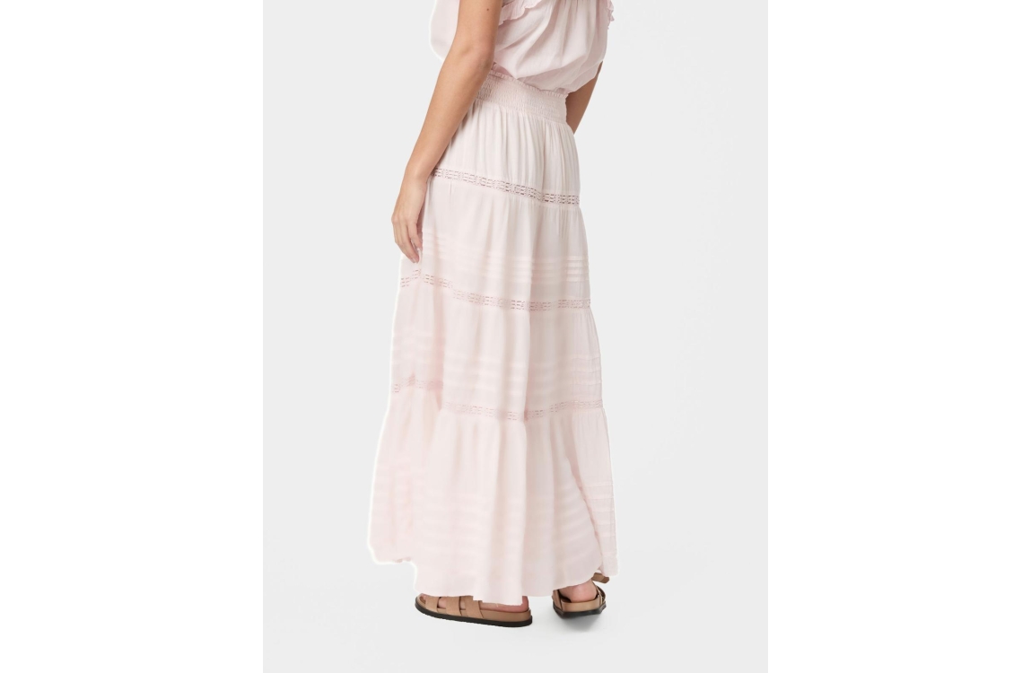 Neo Noir Felicia S volle skirt Light pink. Dit regular fit model sluit door middel van een elastische boord. Deze lichtroze rok van Neo Noir is all-over bewerkt met decoratieve stiksels, kant en ruffles. De rok heeft een hoge taille en is uitgevoerd met luchtige voile stof.