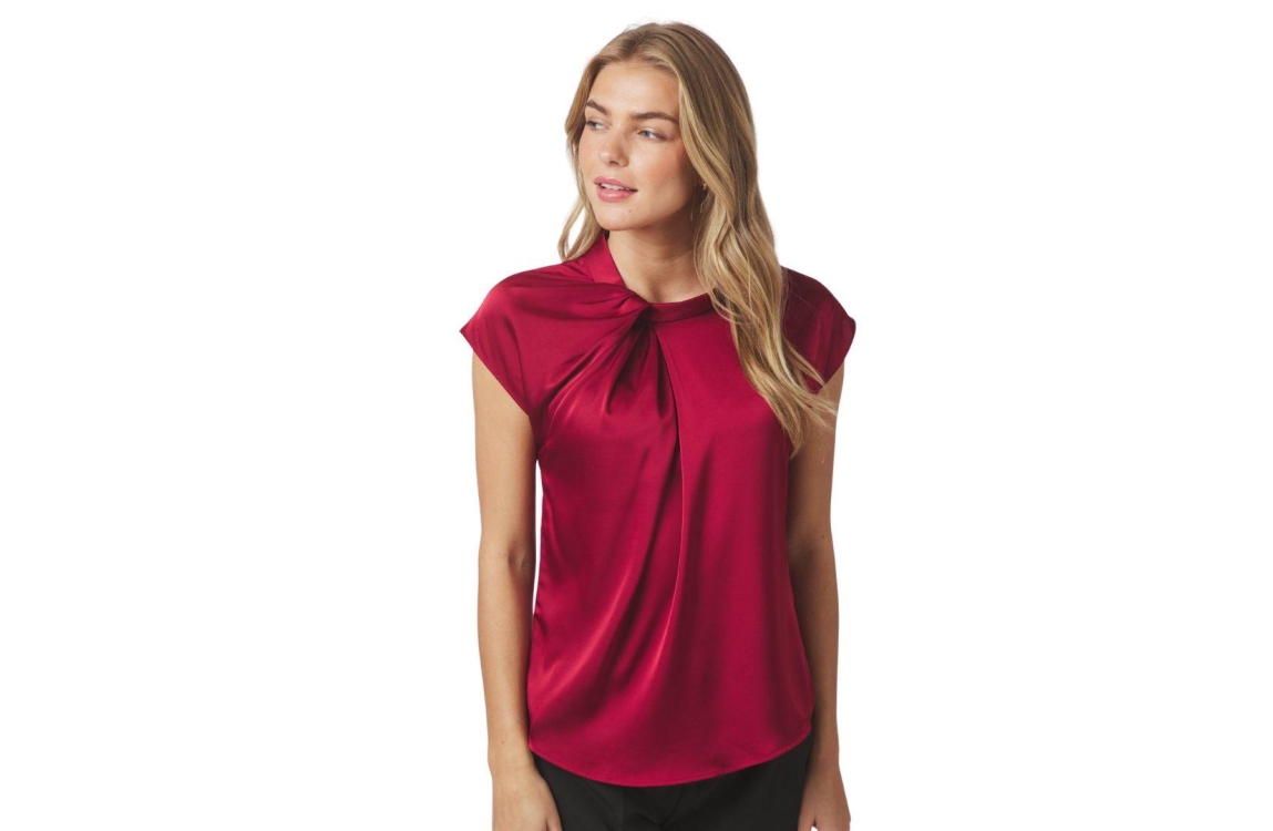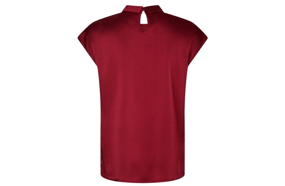 Neo Noir blouse 160990 682. Dit rechtvallende model heeft een ronde halslijn en korte, overgesneden mouwen. Deze wijnrode blouse van Neo Noir is op het voorpand bewerkt met een strik- en plooidetail en is uitgevoerd in een satijnen-look. Het model sluit aan de achterzijde door middel van een knoop.