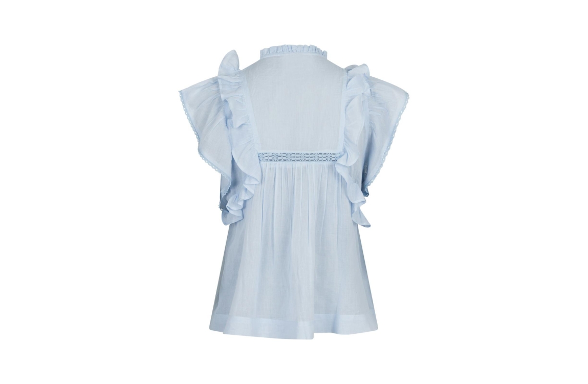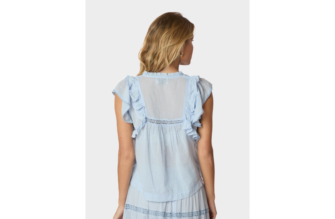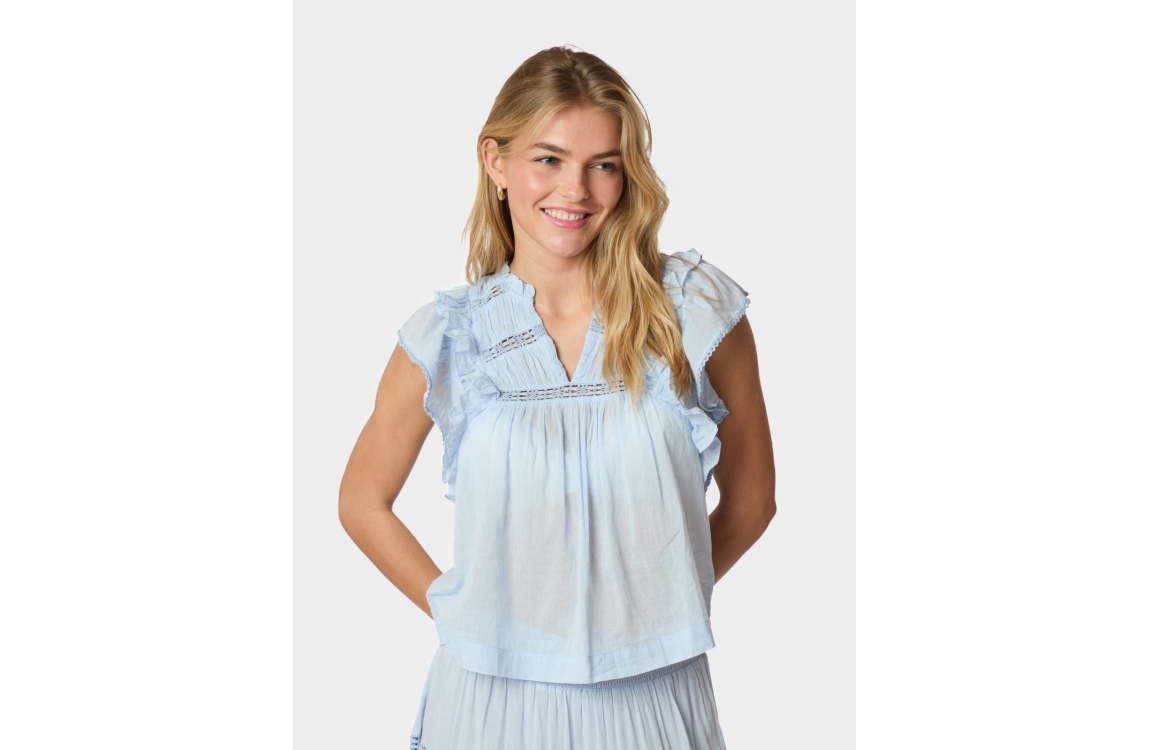 Neo Noir Jayla S voile top 145 Light blue. Dit soepelvallende model heeft een ronde hals met ruffles, V-inkeping en korte mouwen. Deze lichtblauwe top van Neo Noir is all-over bewerkt met kanten details en ruffles.