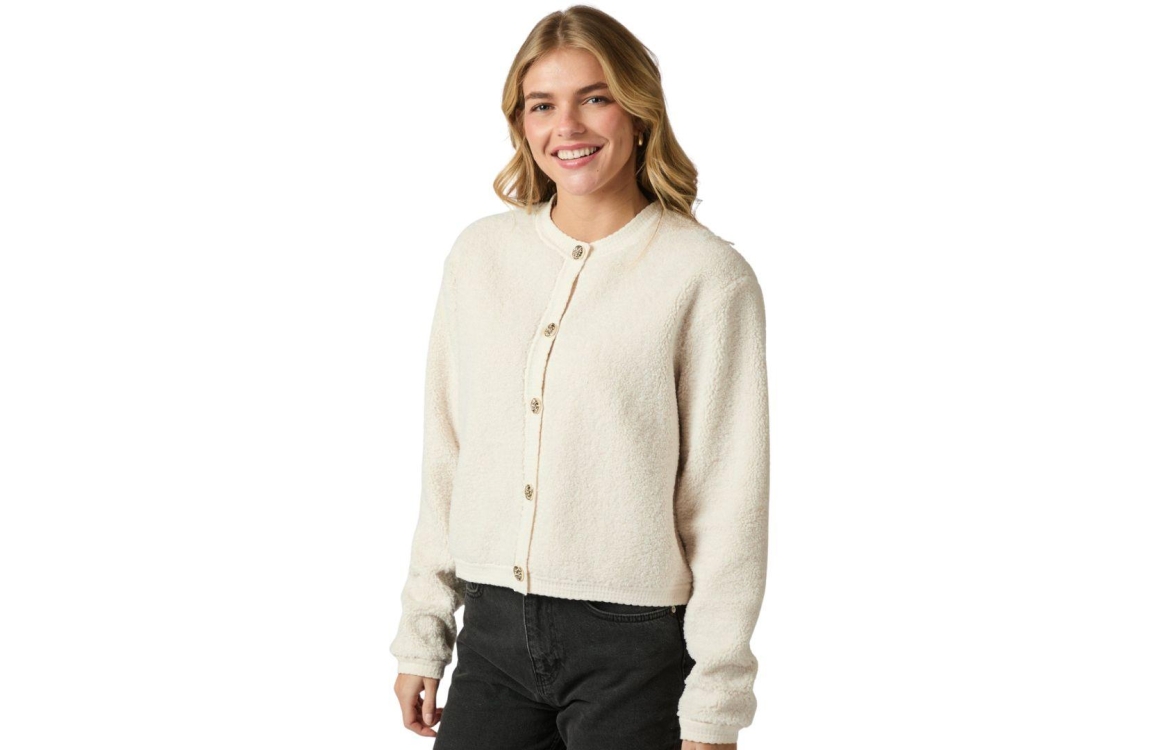 Neo Noir cardigan 161963. Dit rechtvallende model heeft een ronde halslijn en lange mouwen. Deze cremekleurige cardigan sluit aan de voorzijde door middel van gedetailleerde, goudkleurige knopen en is uitgevoerd in fluffy knit kwaliteit. Het model is afgewerkt met effen boorden.