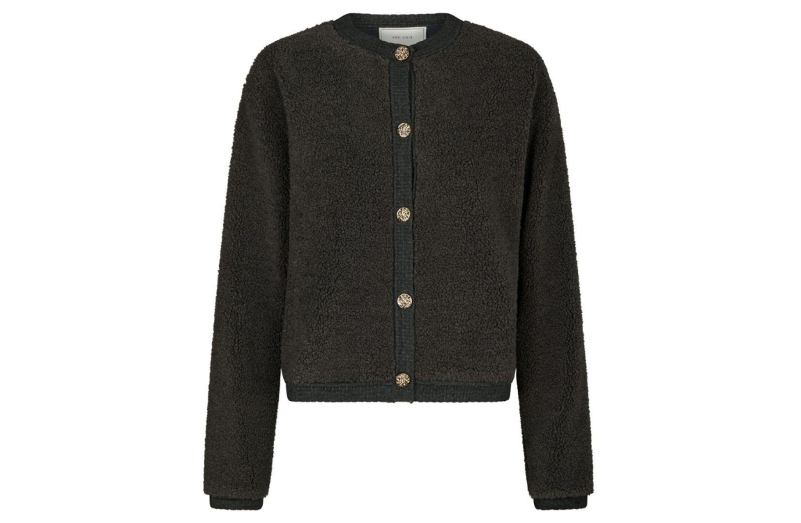 Neo Noir cardigan 161963. Dit rechtvallende model heeft een ronde halslijn en lange mouwen. Deze grijze (antraciet) cardigan sluit aan de voorzijde door middel van gedetailleerde, goudkleurige knopen en is uitgevoerd in fluffy knit kwaliteit. Het model is afgewerkt met effen boorden.
