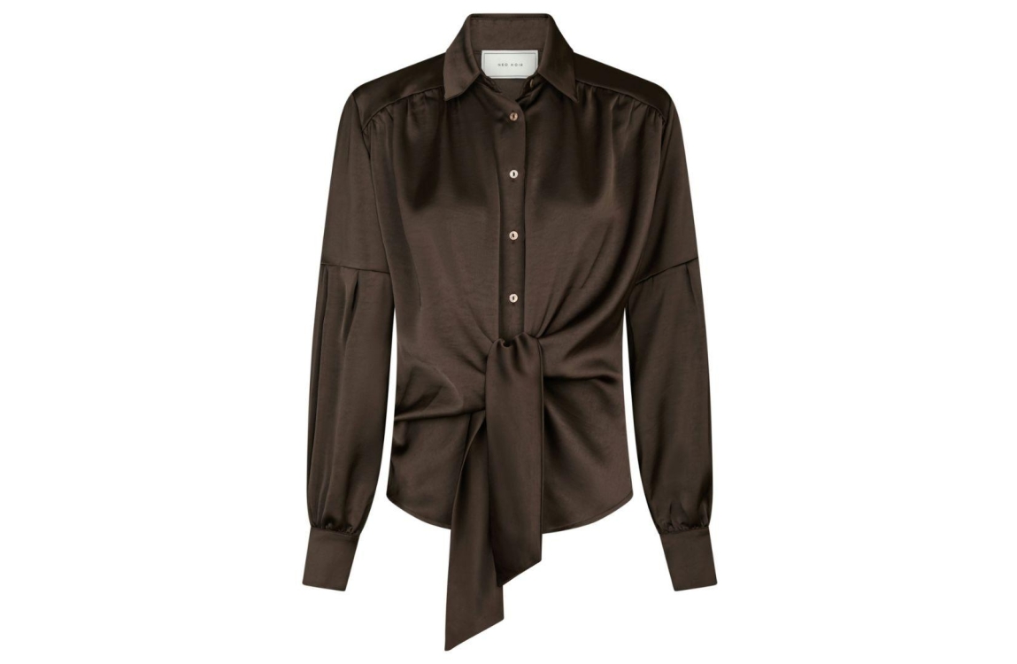 Neo Noir blouse Naja 160801. Dit rechtvallend model heeft een kraag en lange mouwen dat uitloopt als een ballonmouw. Deze bruine satijnen look and feel blouse van Neo Noir sluit door middel van knopen en een strik aan de voorzijde.