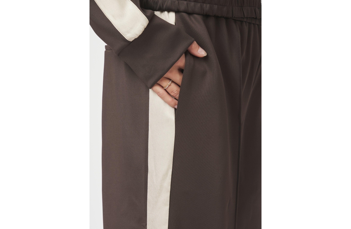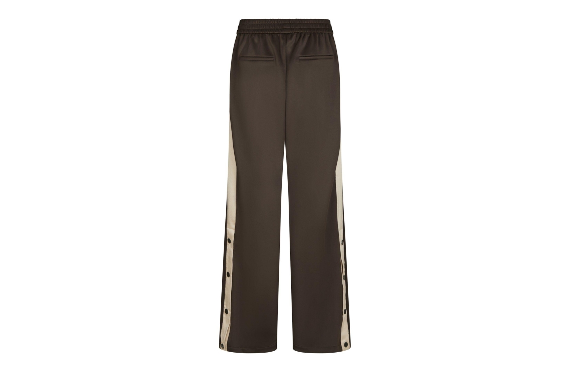 Neo Noir Puggy track suit broek 154249. Dit wide fit model sluit door middel van een elastische boord. Deze donkerbruine broek van Neo Noir is bewerkt met een beige bies en knopen.