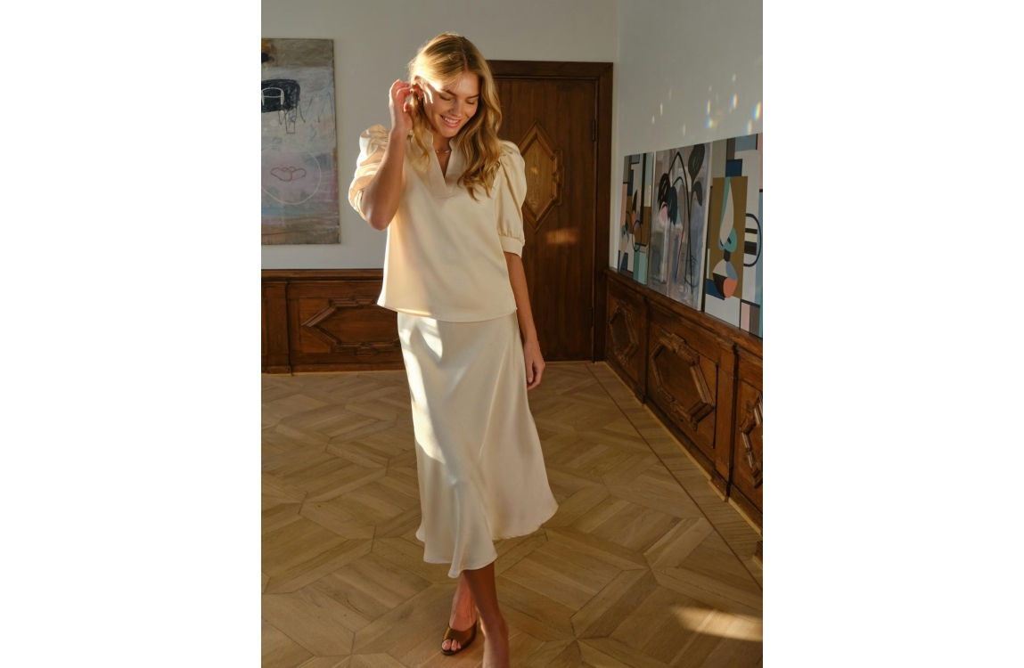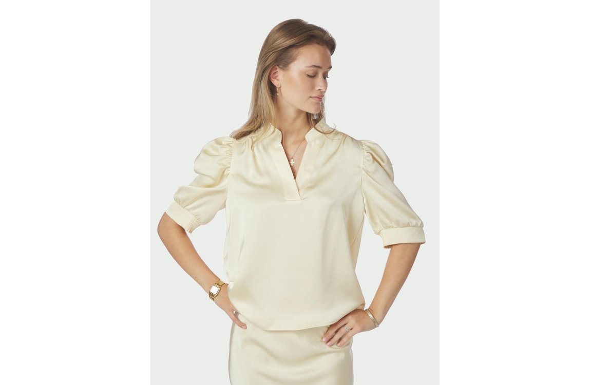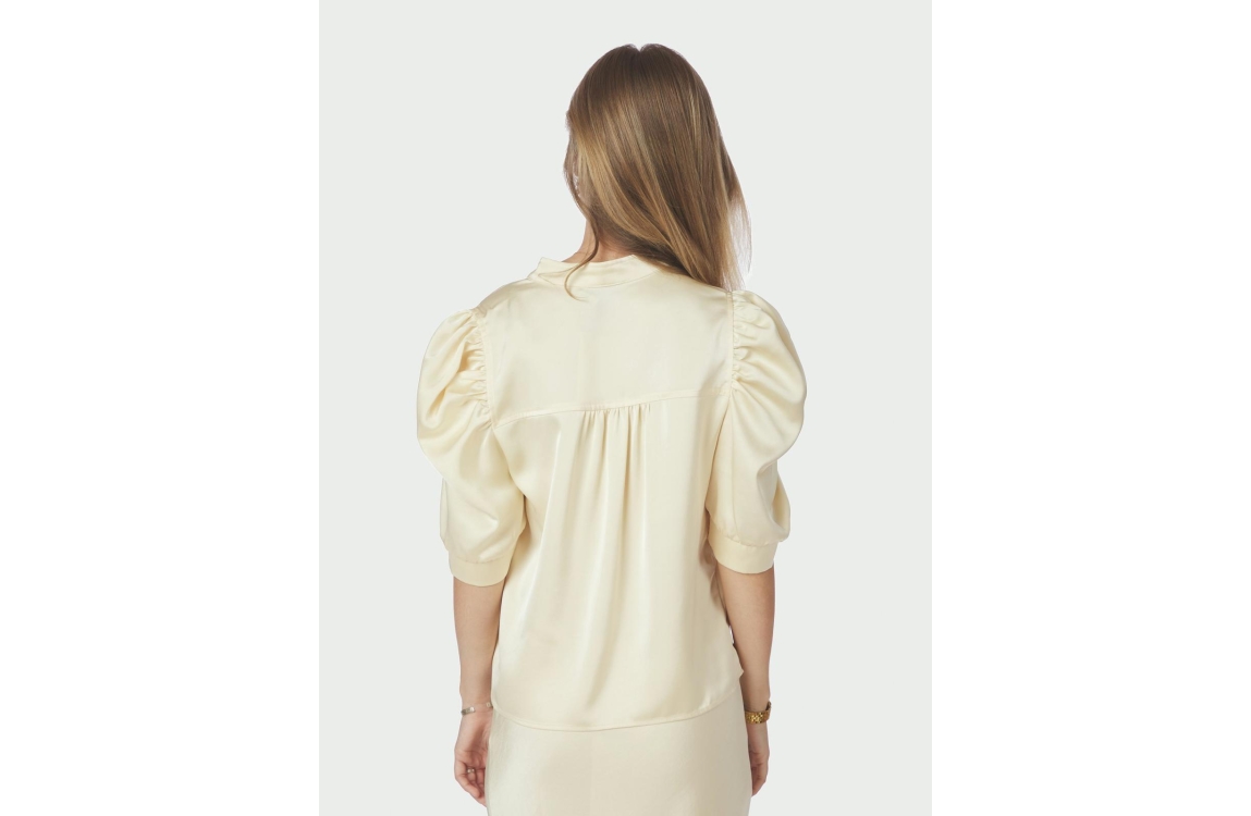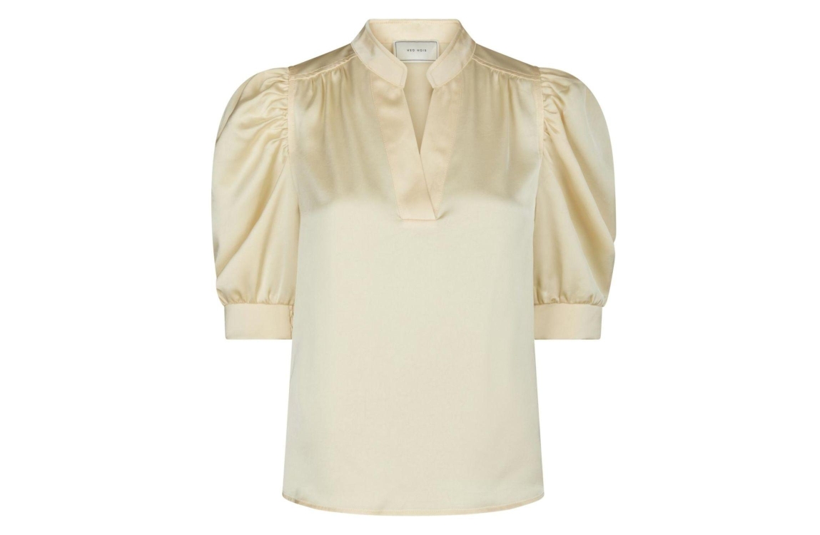 Neo Noir Roella heavy sateen blouse 191 Light yellow. Dit rechtvallende model is voorzien van een ronde hals met v-inkeping en heeft halflange pofmouwen. Deze licht gele blouse van Neo Noir is uitgevoerd in een satijnen look and feel kwaliteit.
