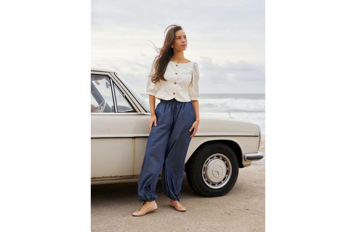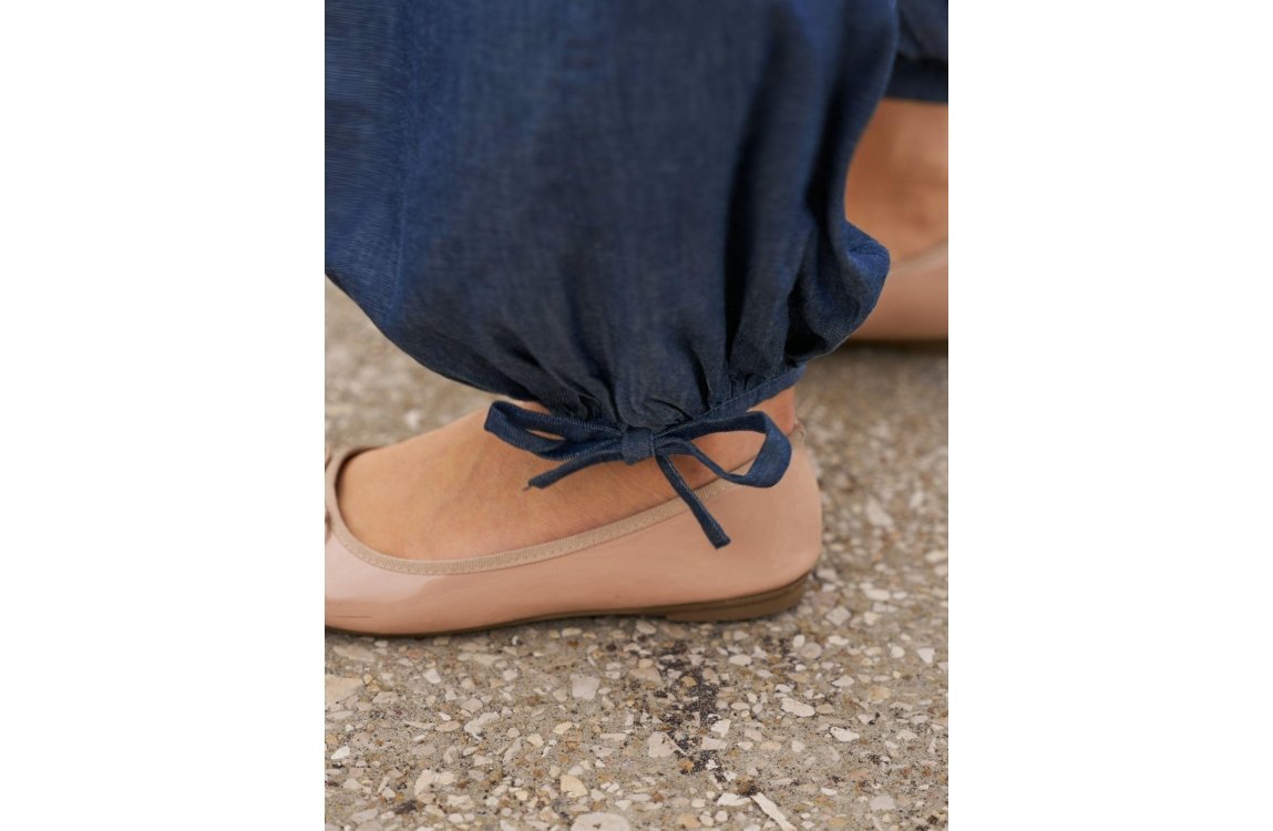 Neo Noir Roxane Balloon broek 169312. Dit balloon fit model sluit door middel van een elastische boord en een trekkoord. Deze donkerblauwe denim broek van Neo Noir is voorzien van schuine steekzakken en afgewerkt met een strikkoord aan de onderzijde.