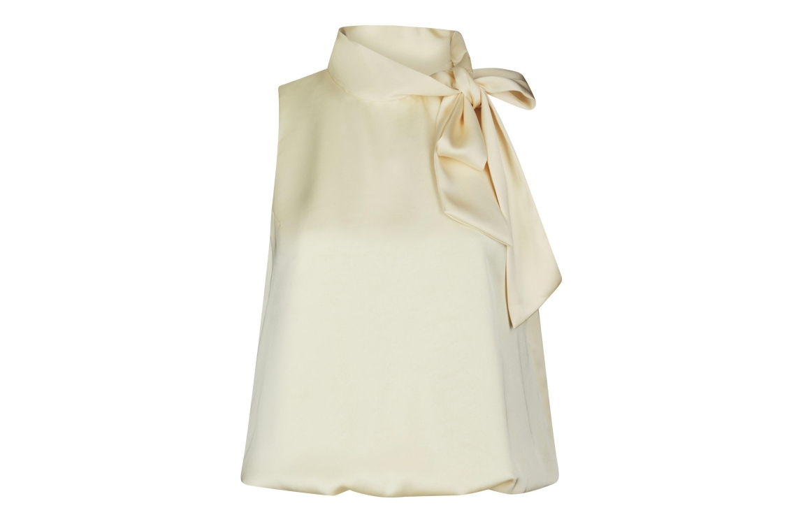 Neo Noir Veda top 168291. Dit soepelvallend model heeft een hoge ronde hals en is mouwloos. Deze gele top van Neo Noir is bewerkt met een strik aan de bovenzijde en is uitgevoerd in een satijnen look. Aan de onderzijde sluit dit model aan door middel van een elastische boord.