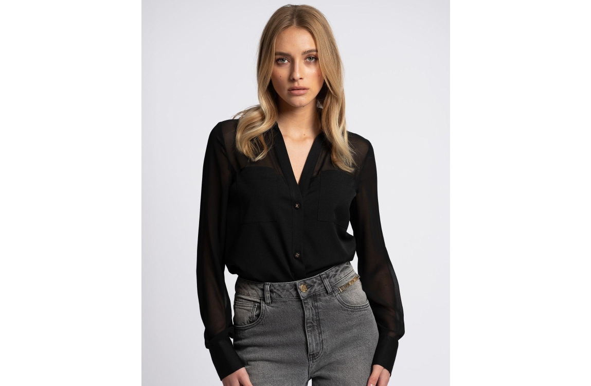 Nikkie Larisa Blouse 9000 Black. Dit rechtvallende model is voorzien van een v-hals en heeft lange mouwen afgewerkt met een logo knoop. Deze zwarte blouse van Nikkie sluit door middel van knopen. Dit model is bewerkt met twee borstzakken.