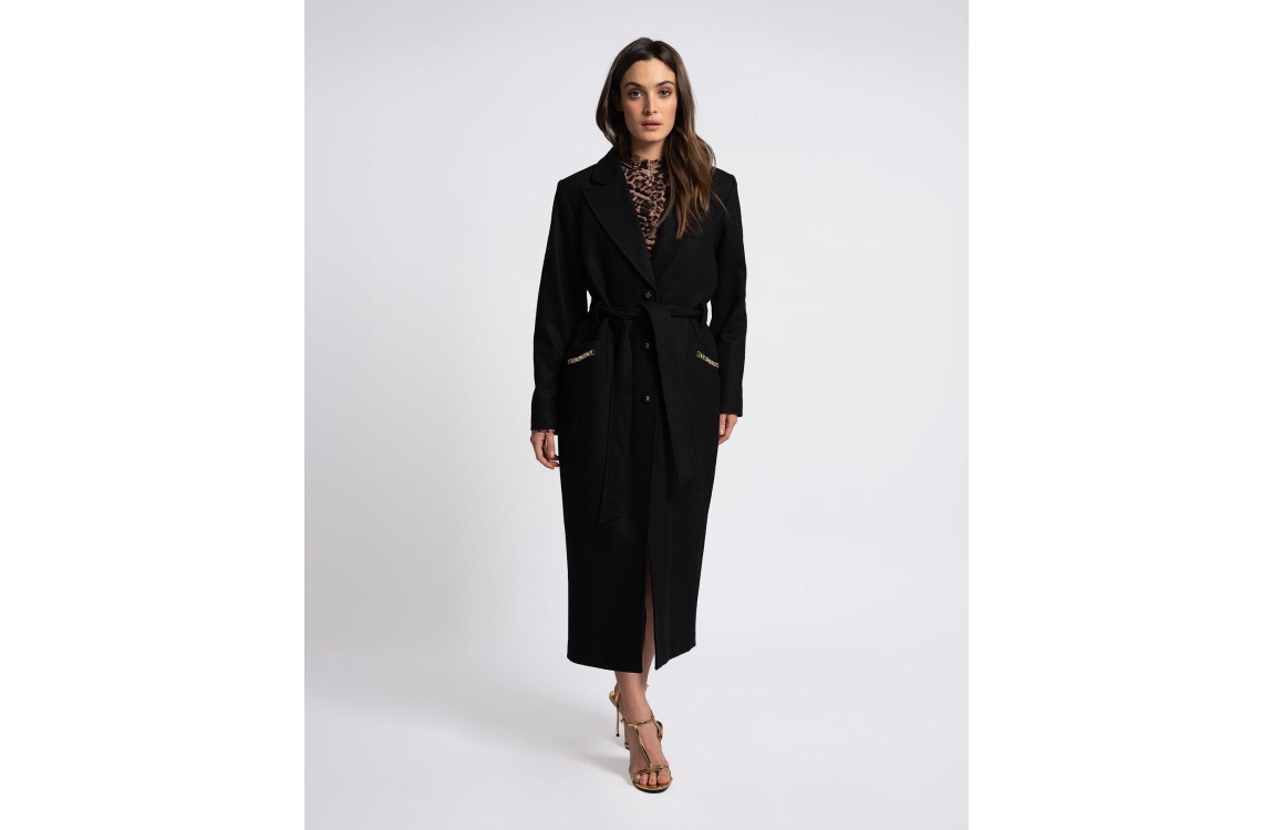 Nikkie Lille Coat 9000 Black.  Dit rechtvallende model heeft een reverskraag en lange mouwen. Deze zwarte jas van Nikkie beschikt over twee steekzakken aan de voorzijde en sluit door middel van knopen en een ceintuur met ceintuurlussen om de middel. Dit model is afgewerkt met ketting details.