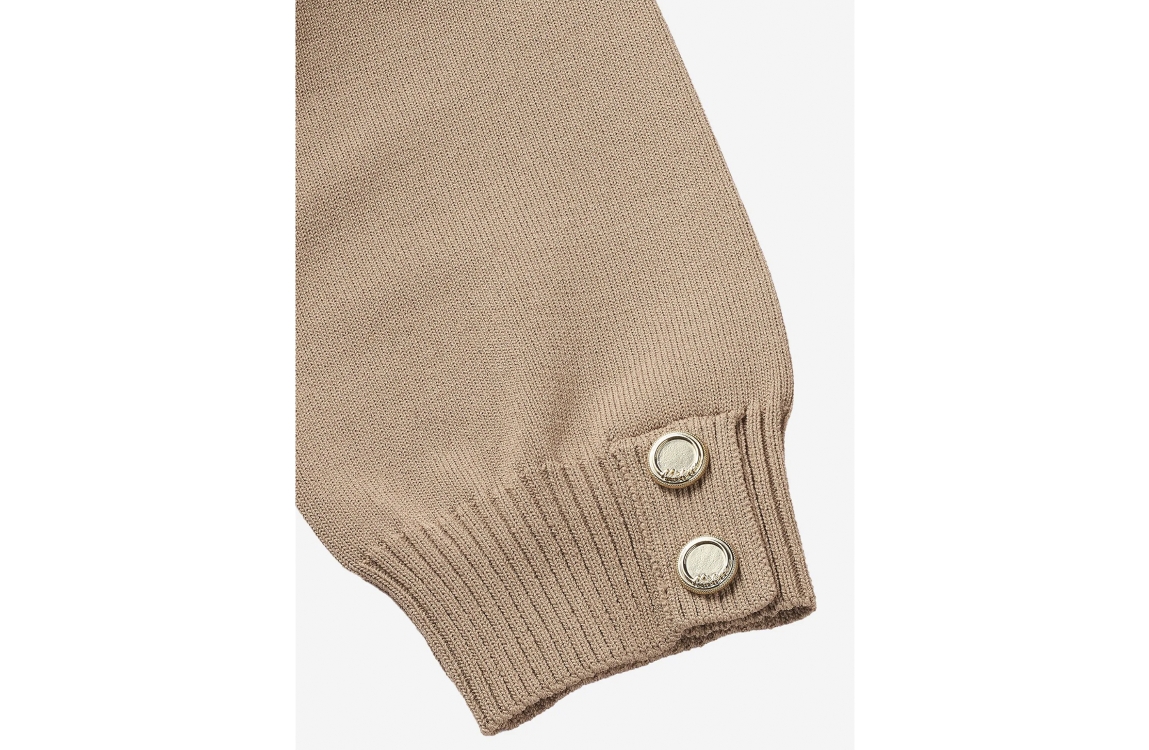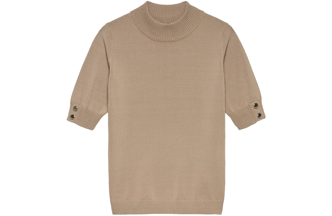 NIKKIE top Olindah 5023. Dit rechtvallende model is voorzien van een turtle hals en heeft korte mouwen afgewerkt met knopen. Deze lichtbruine top van NIKKIE is afgewerkt met ribgebreide boorden.