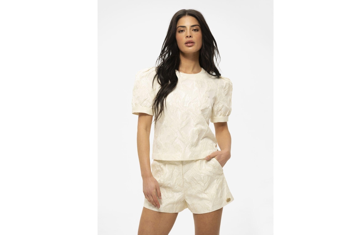 Nikkie Pamona Short 2001 Cream. Dit rechtvallende model sluit door middel van een knoop en rits afgewerkt met ceintuurlussen. Deze creme kleurige short van Nikkie is all-over bewerkt met een crinkle structuur en heeft twee steekzakken. Dit model is voorzien van een subtiel logo detail en heeft een middel/hoge taille.