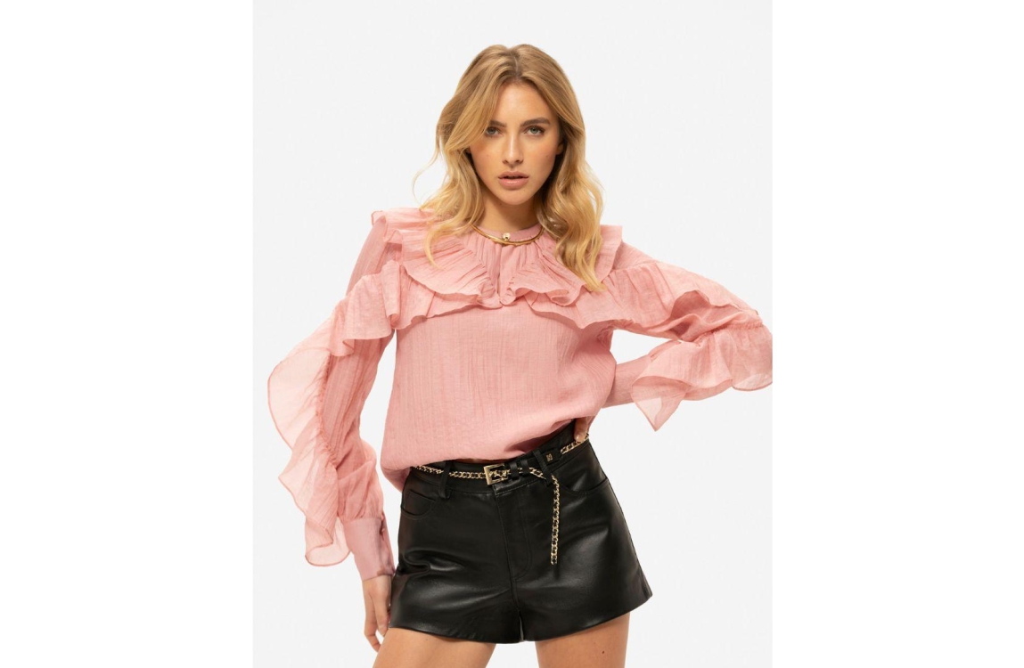 Nikkie blouse Pharr N 6-290 2602. Dit rechtvallend model is voorzien van een ronde hals met knoopje en split detail en heeft lange mouwen. Deze roze blouse van Nikkie is all-over bewerkt met ruffles.
