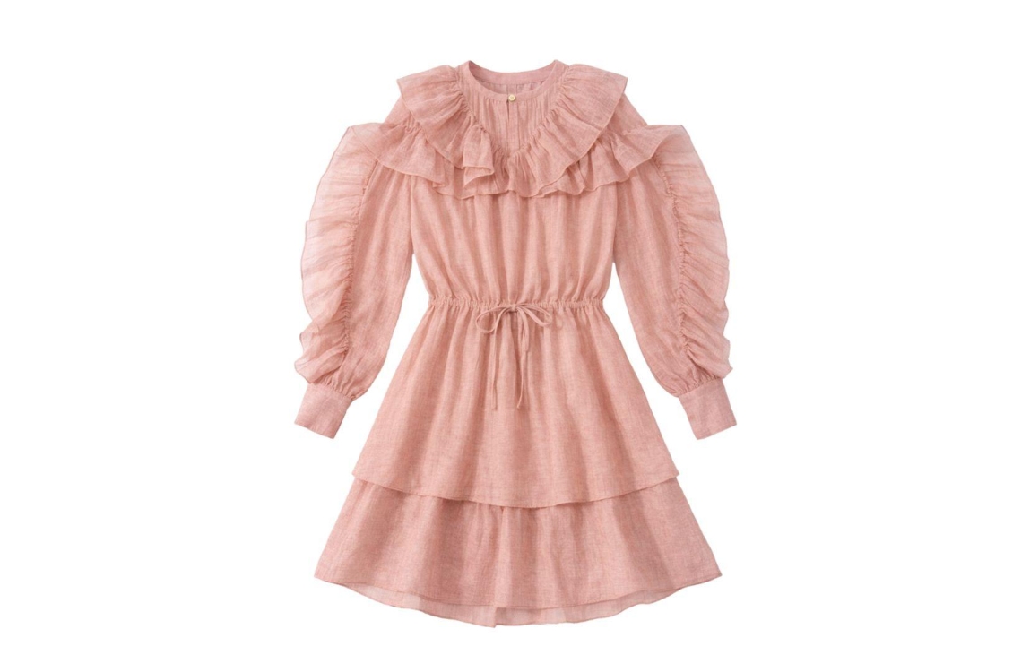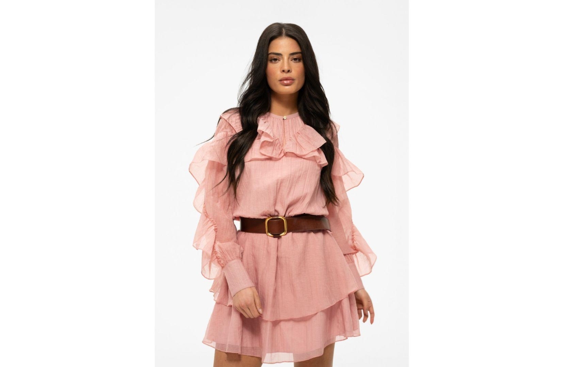 Nikkie jurk Pharr N 5-291 2602. Dit rechtvallend model is voorzien van een ronde hals met knoopje en split detail en heeft lange mouwen. Deze roze gelaagde jurk van Nikkie is all-over bewerkt met ruffles en beschikt over een strikkoord in de taille.