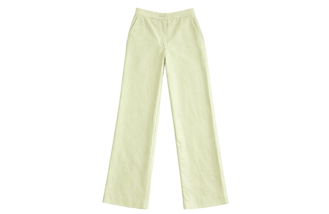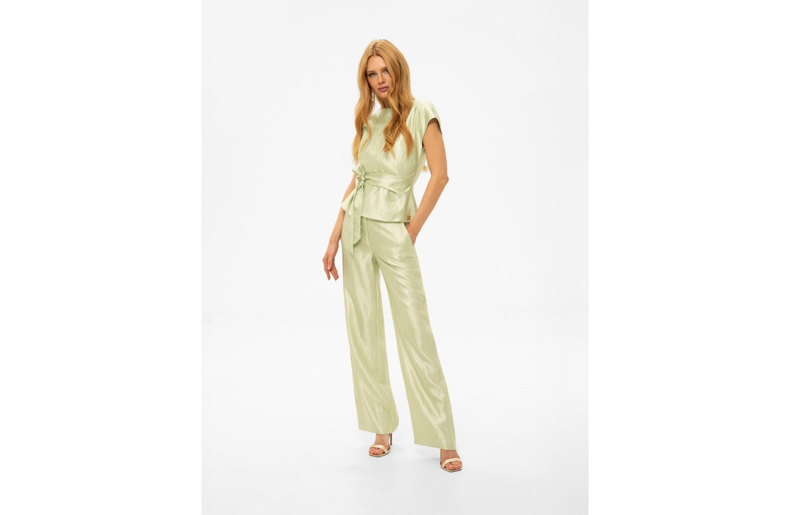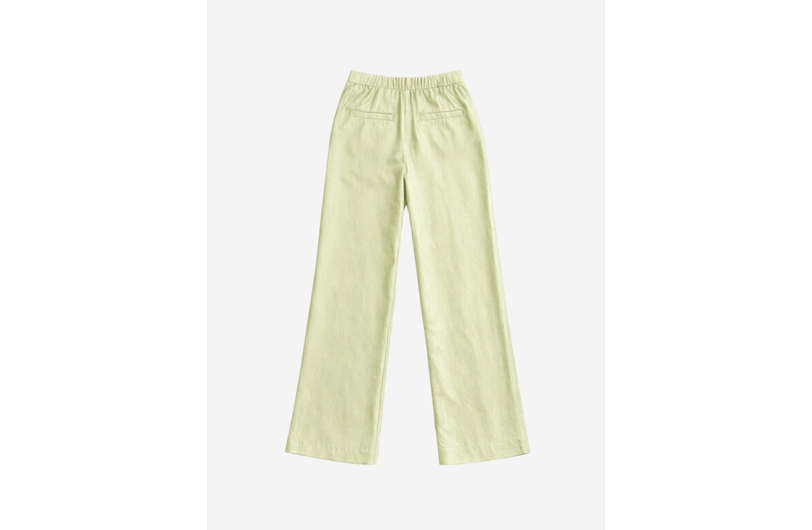 Nikkie Porlamar Pants 6959 Aloe Vera. Dit rechtvallende model sluit door middel van een knoop en een rits en heeft wijde pijpen. Deze groene pantalon van Nikkie is all-over bewerkt met subtiele glitters en heeft verschillende broekzakken. Dit model is voorzien van een elastische tailleband aan de achterkant en heeft een hoge taille.