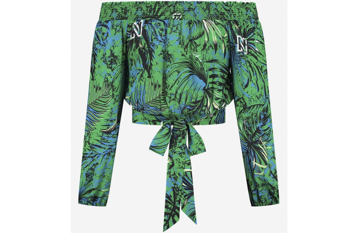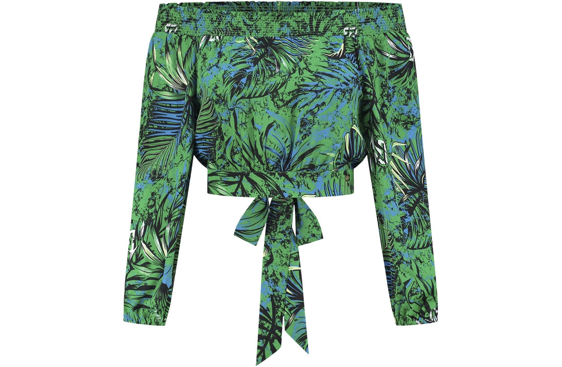 Nikkie top Rana Island N6-044 2304. Dit off-shoulder model is voorzien van lange mouwen afgewerkt met een elastische inzet en beschikt rond de hals van smock en ruches. Deze groene cropped top van Nikkie is all-over bewerkt met een blad dessin afgewerkt met een elastische boord en strikdetail aan de onder- achterzijde.