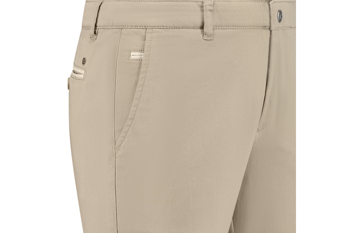 NORTH84 Luxury Comfort Chino 21282134. Dit rechtvallend model sluit door middel van een knoop en een rits. Deze beige chino van NORTH84 is voorzien van verschillende broekzakken en ceintuurlussen. Dit model is all-over bewerkt met een subtiele print.