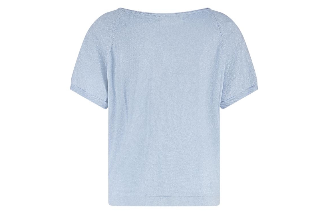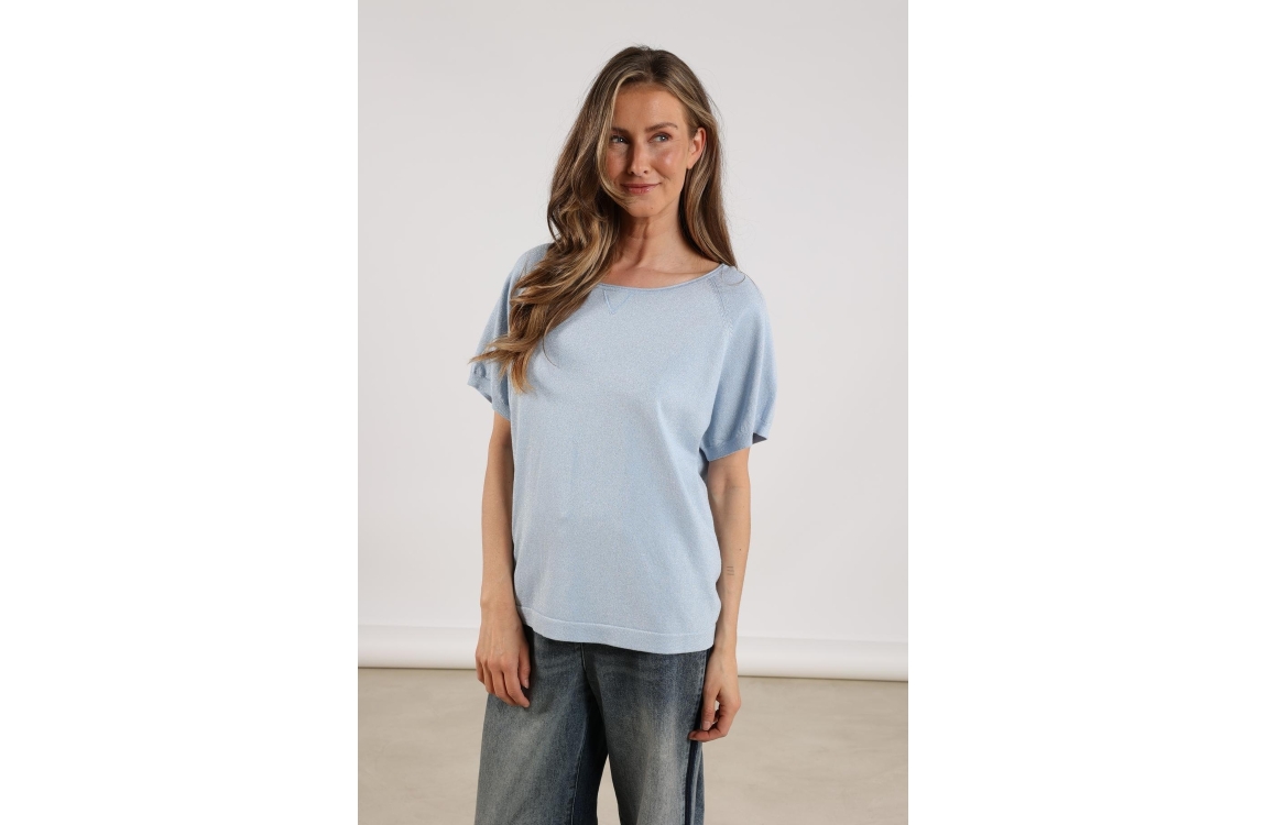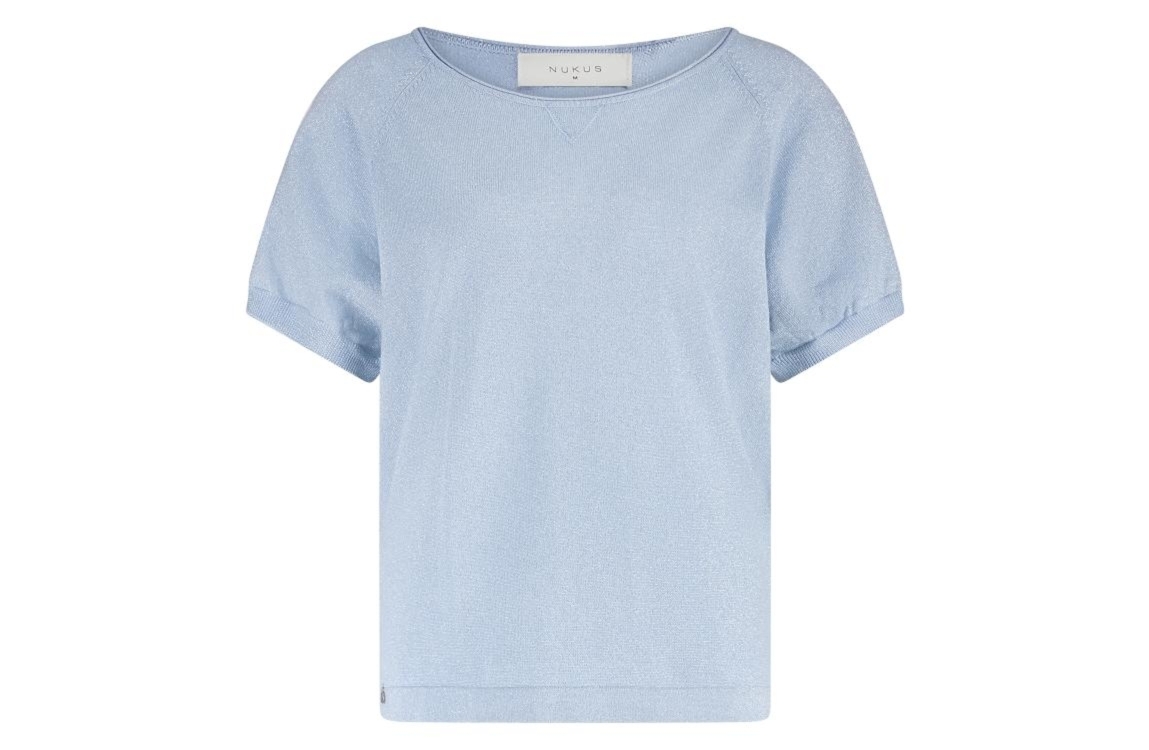 NUKUS top Anita NKS01085. Dit rechtvallend model heeft een ronde hals en korte mouwen. Deze lichtblauwe top van NUKUS is all-over bewerkt met glitterlurex en is uitgevoerd in stretchkwaliteit.