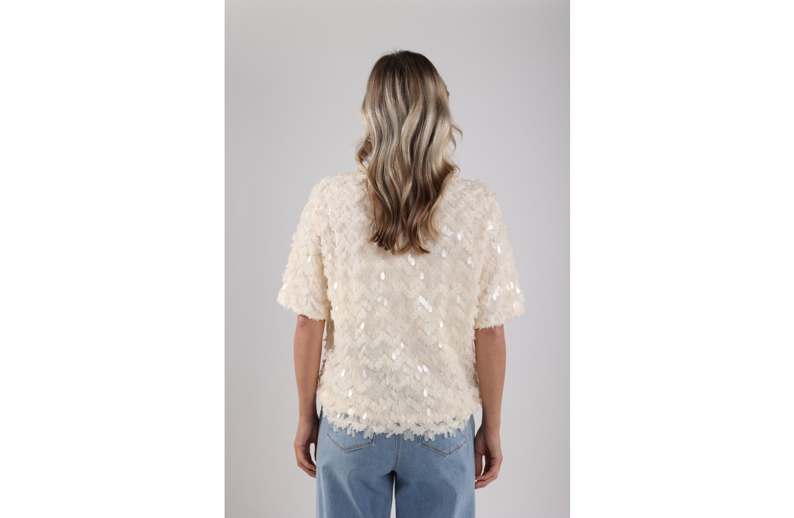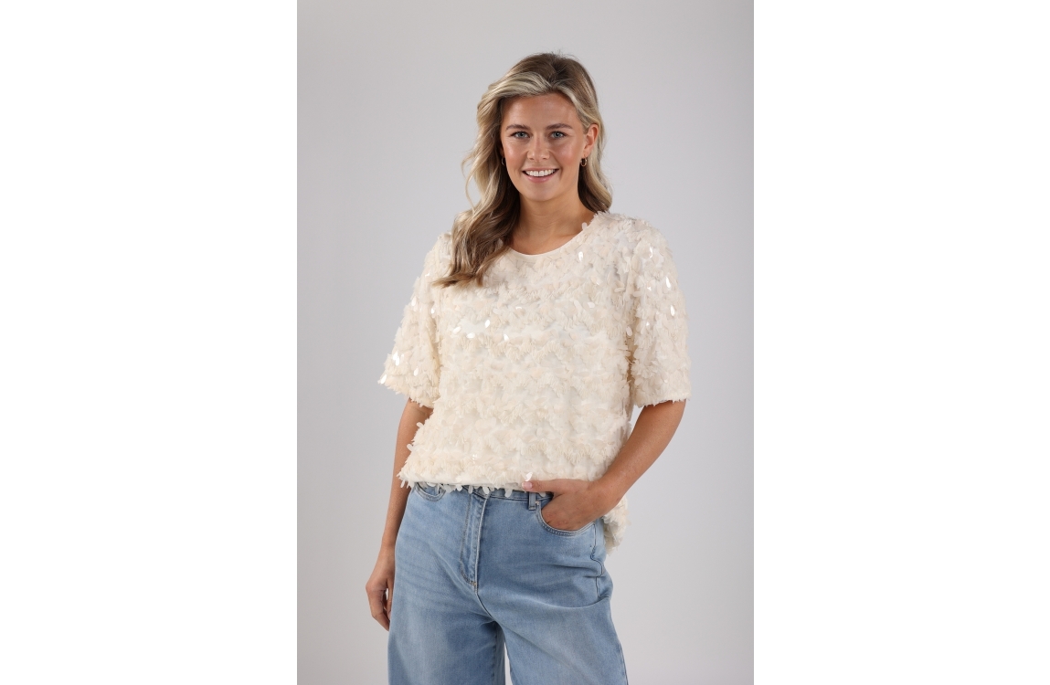 Nukus top aria nks01007. Dit rechtvallend model is voorzien van een ronde hals en heeft korte mouwen. Deze créme kleurige top van Nukus is bewerkt met kant en pailletten en beschikt over een voering.