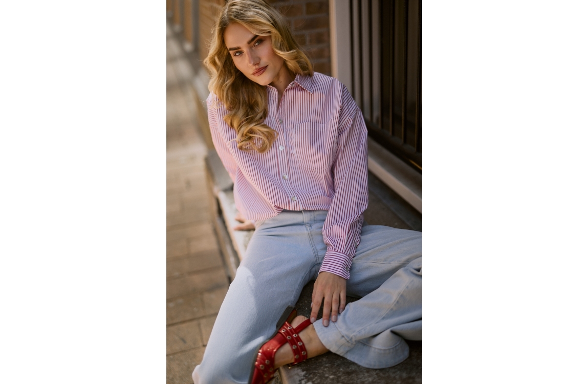 NUKUS Ariana Blouse Stripe 372 kiss/offwhite. Dit rechtvallende model heeft een kraag en lange mouwen. Deze rood-wit gestreepte blouse van NUKUS sluit door middel van knopen.