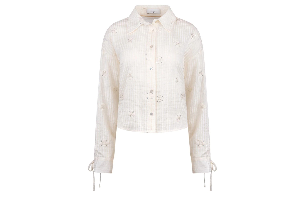 NUKUS Bailey Blouse Beads 17 off white. Dit rechtvallende model heeft een kraag en lange mouwen. Deze gebroken witte blouse van NUKUS sluit door middel van knopen en is een iets korter model. Dit model is bewerkt met een subtiel streepmotief met borduur en pailletten. Deze blouse is afgewerkt met een strikdetail bij de machetten.