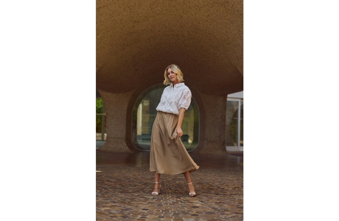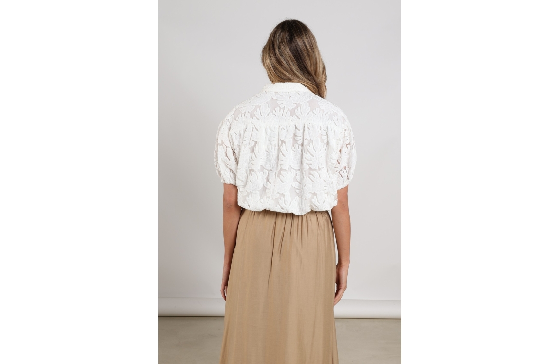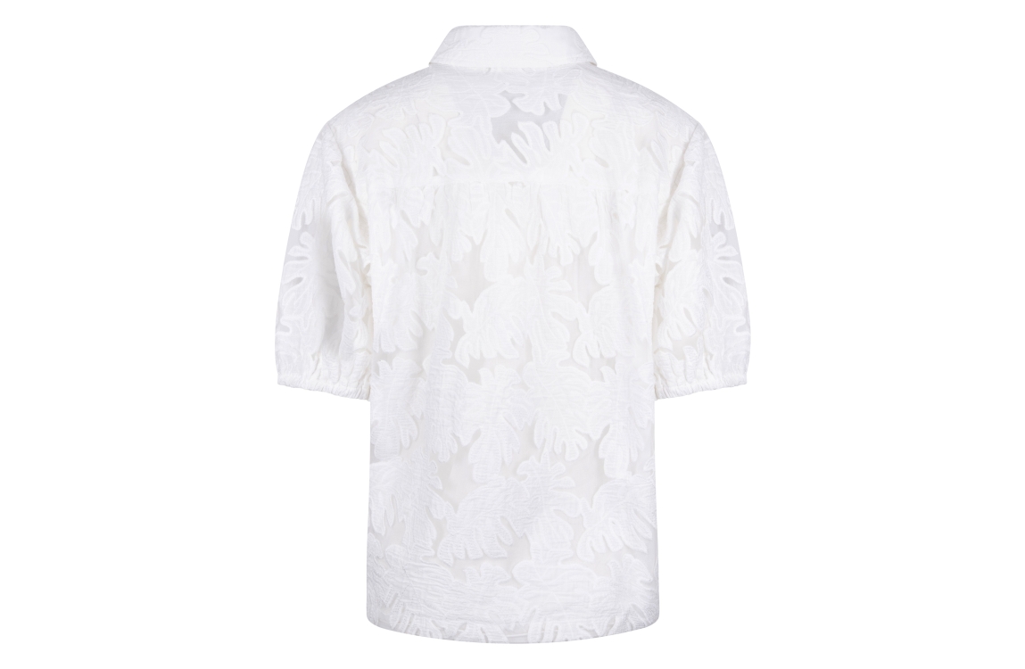 NUKUS Berit Blouse Embroidery 17 off white. Dit rechtvallende model is voorzien van een kraag en heeft korte pofmouwen. Deze witte blouse van Nukus sluit door middel van knopen en is bewerkt met een ubtiele bloemprint in embroidery. Aan de onderkant van de blouse zit elastiek die verstelbaar is.