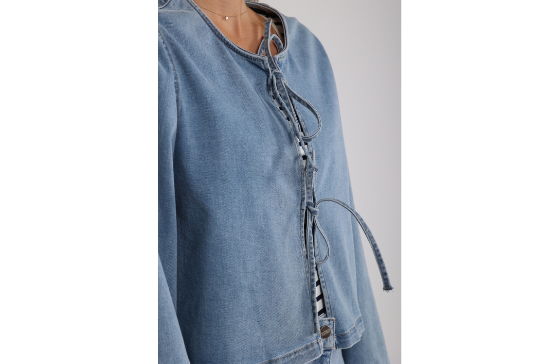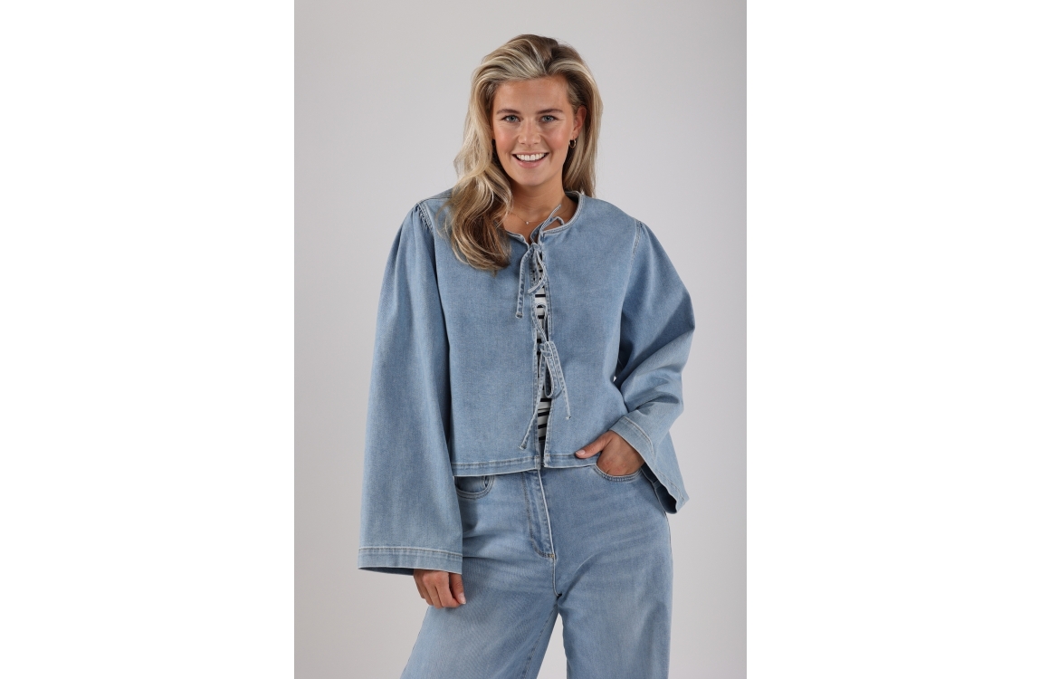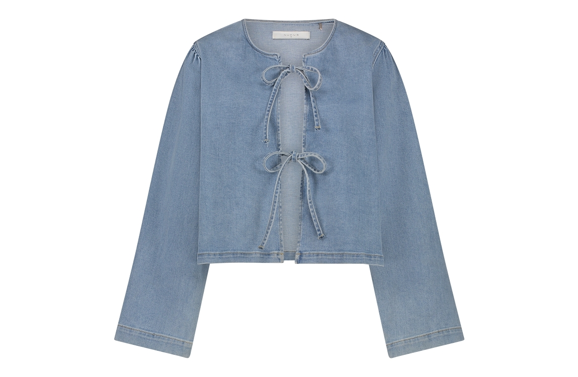 Nukus blouse Bowy NKS02067. Dit rechtvallend model is voorzien van een ronde hals en heeft wijde lange mouwen. Deze denim blouse van Nukus sluit aan de voorzijde door middel van twee strikken.