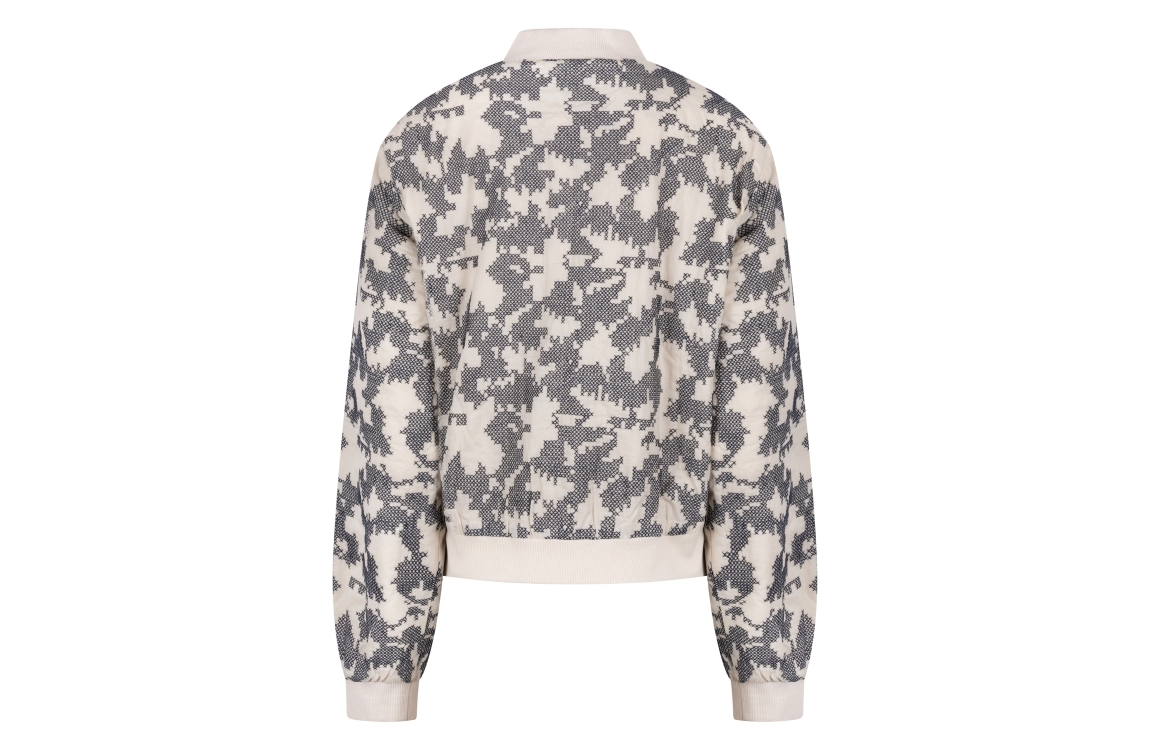NUKUS Charlie Bomber Cross 296 sand/navy. Dit bomber model is voorzien van een ronde hals en heeft lange mouwen. Deze beige bomber van Nukus sluit door middel van een rits en is all-over bewerkt met een cross print in beige en donker blauw. Dit model is afgewerkt met ribboorden.