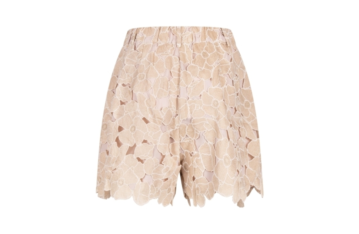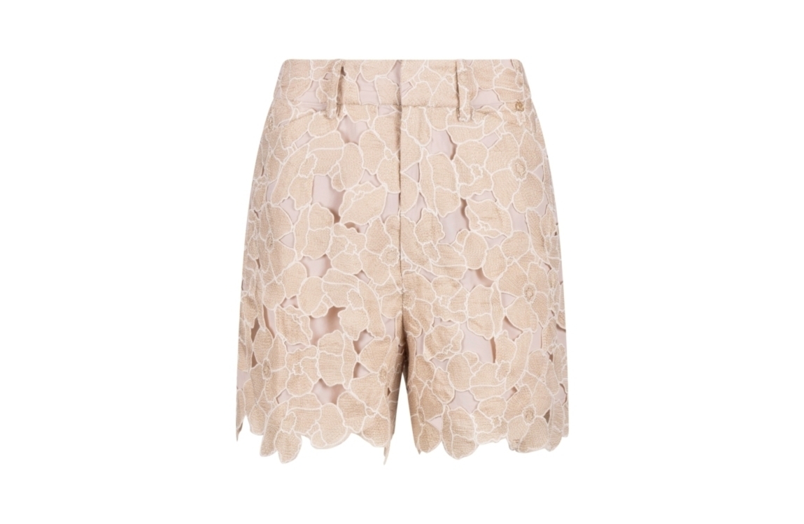 NUKUS Dagmar Short Flower 239 sand/gold. Dit rechtvallende model sluit door middel van een knoop en rits afgewerkt met ceintuurlussen. Deze bruine short van Nukus is afgewerkt met elastiek aan de achterkant. Dit model is all-over bewerkt met opengewerkte bloemenprint en een lurex.