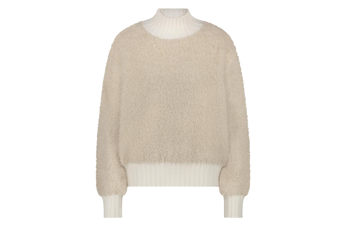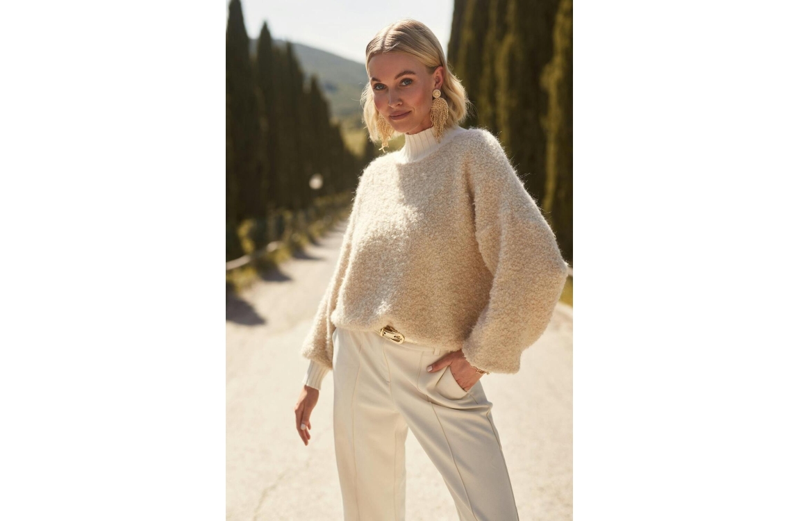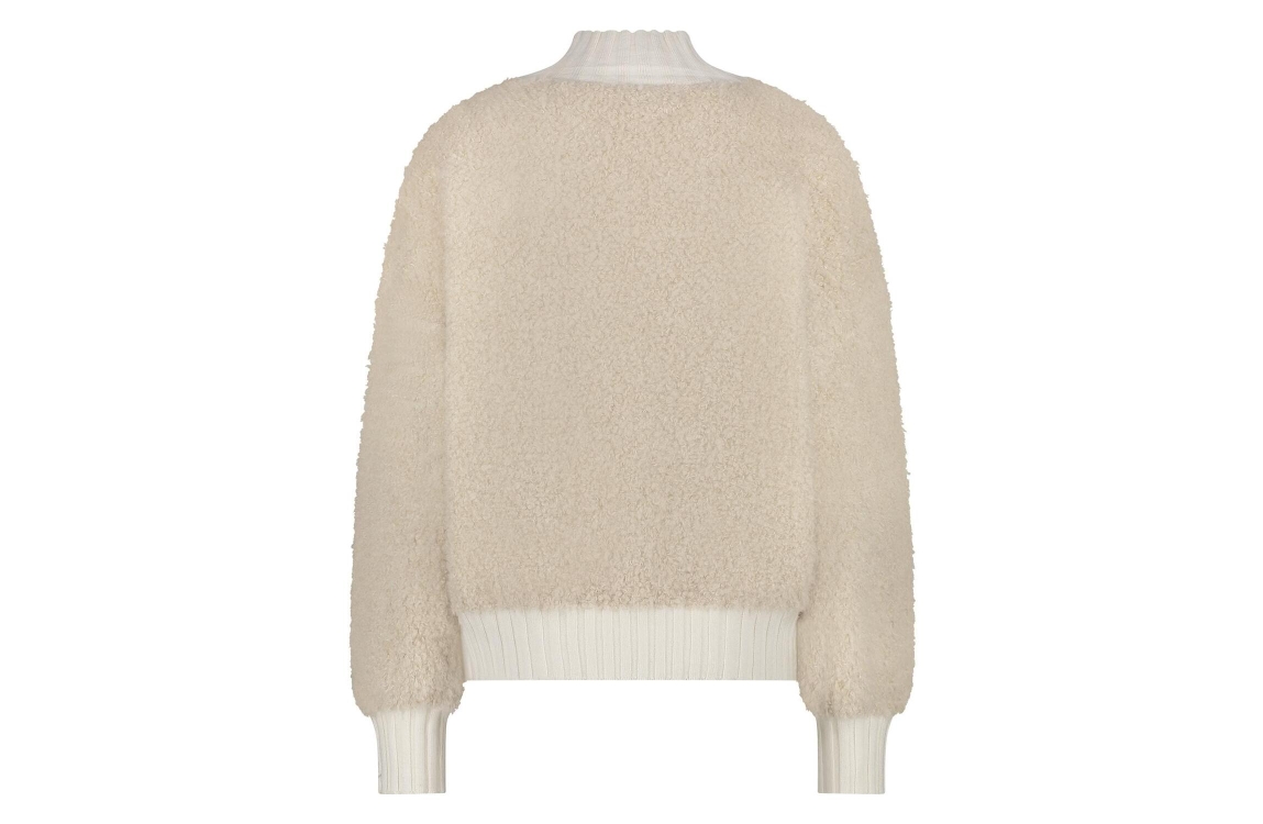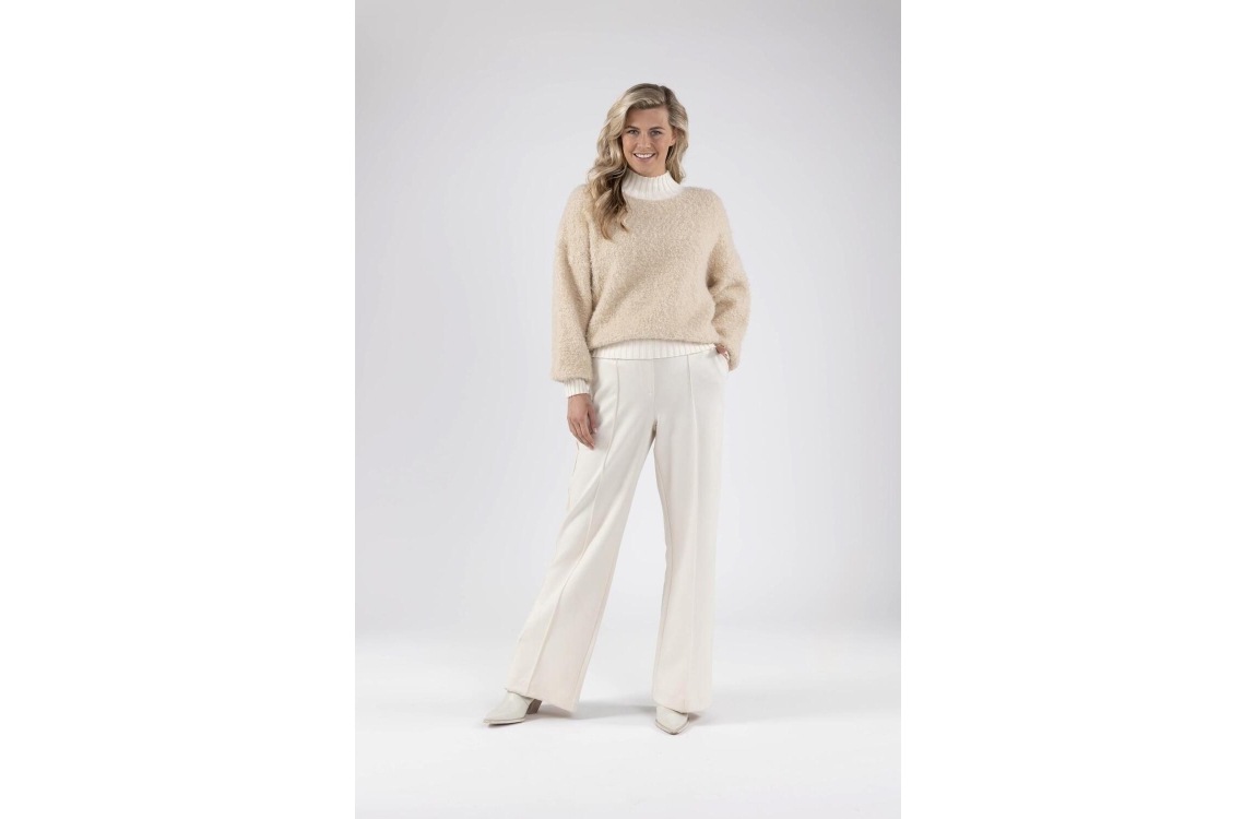 Nukus Essy pullover FW240629. Dit rechtvallend model is voorzien van een col en heeft lange mouwen. Deze beige pullover van Nukus is bewerkt met een zachte teddy kwaliteit en is afgewerkt met ribboorden.