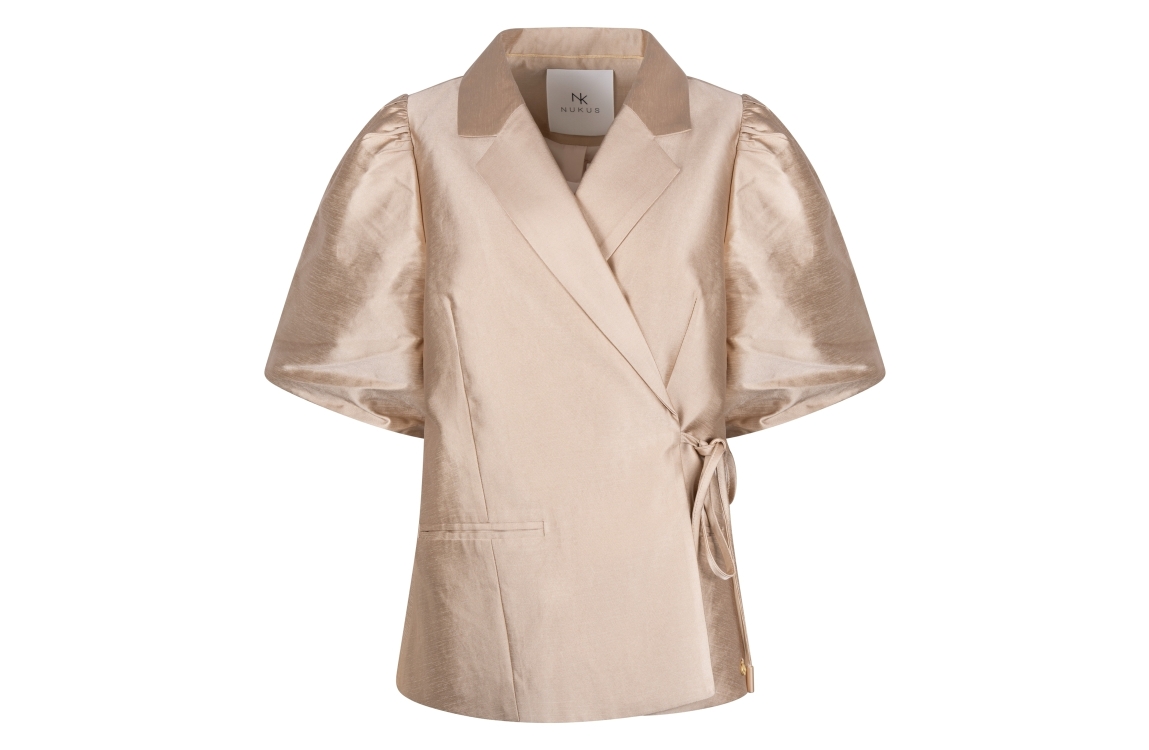 NUKUS Fabienne Blazer 4 gold. Dit rechtvallende model is voorzien van een reverskraag en heeft korte pofmouwen. Deze goud kleurige blazer van Nukus sluit door middel van een striksluiting aan de voorkant. Dit model is bewerkt met een satijnglans.