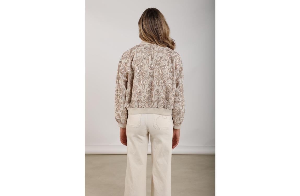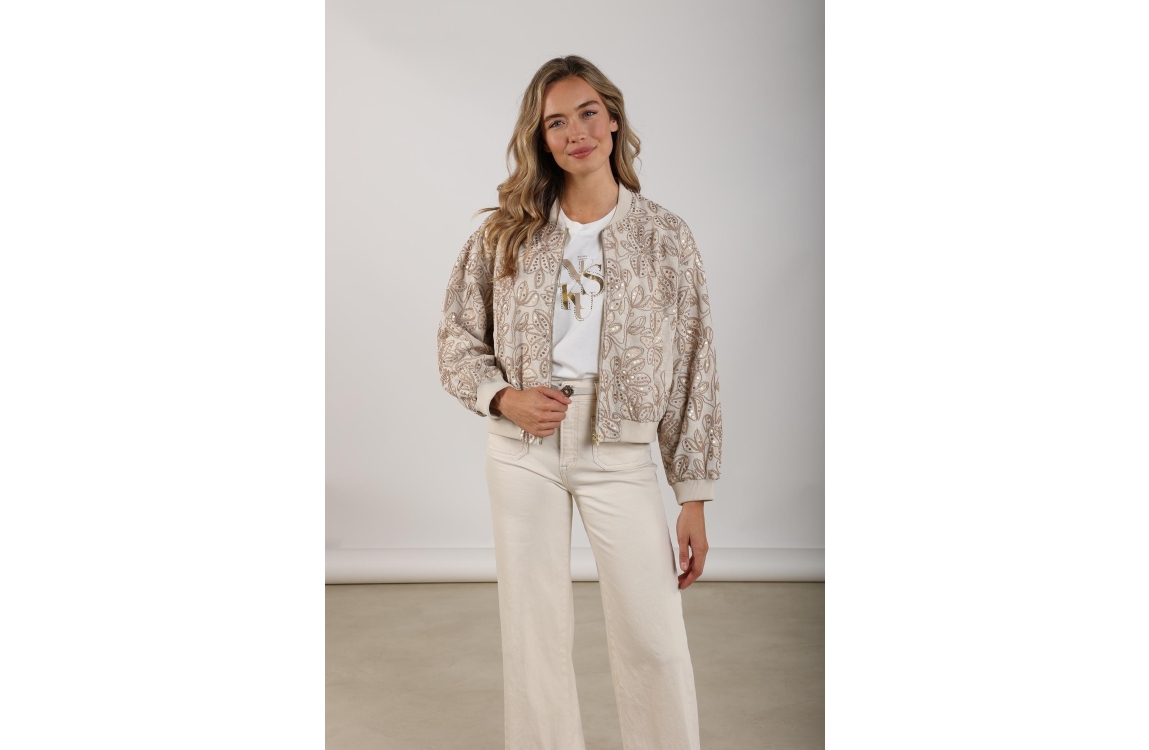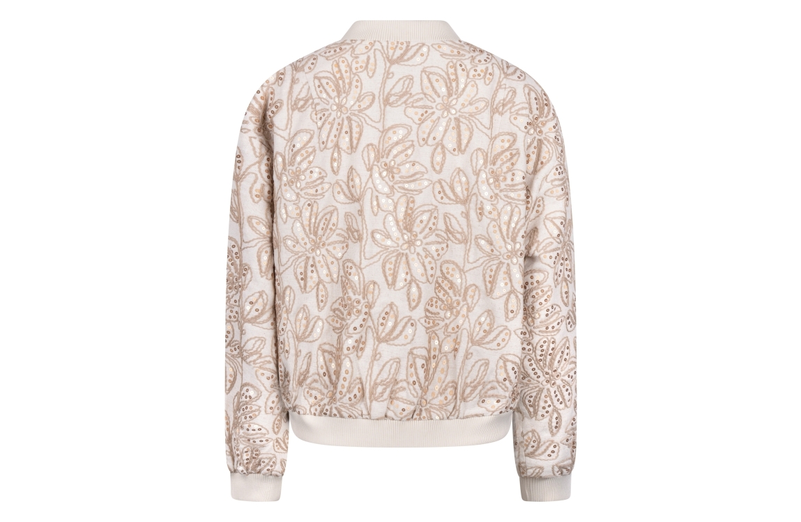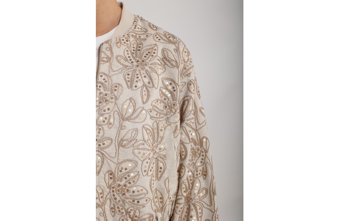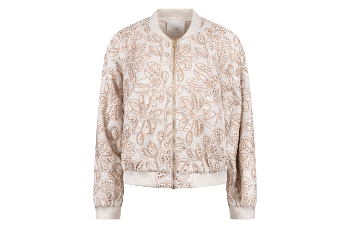 NUKUS Ginny Bomber Paillet 9 sand. Dit bomber model is voorzien van een ronde hals en heeft lange mouwen. Deze licht bruine bomber van Nukus sluit door middel van een rits en is all-over bewerkt met pailletten en een borduursel van bloempatronen. Dit model is afgewerkt met ribboorden en twee steekzakken.