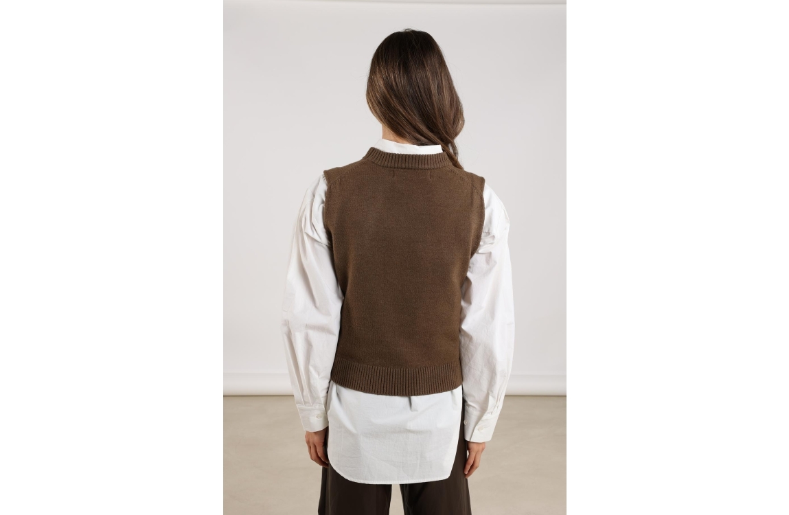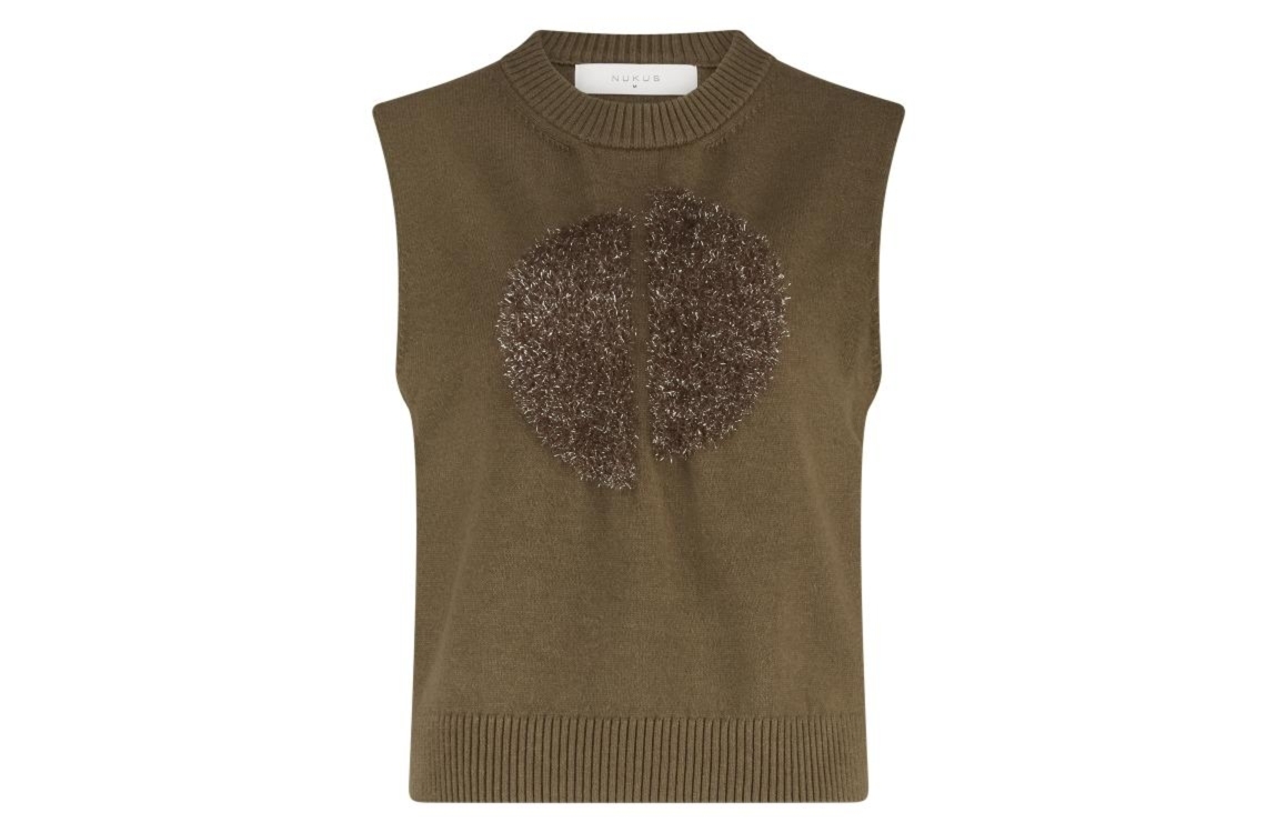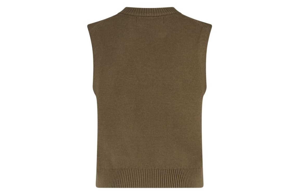 Nukus spencer Intarsia NKF07000. Dit rechtvallend model is voorzien van een ronde hals en is mouwloos. Deze bruine spencer van Nukus is bewerkt met men print aan de voorzijde afgewerkt met lurex.