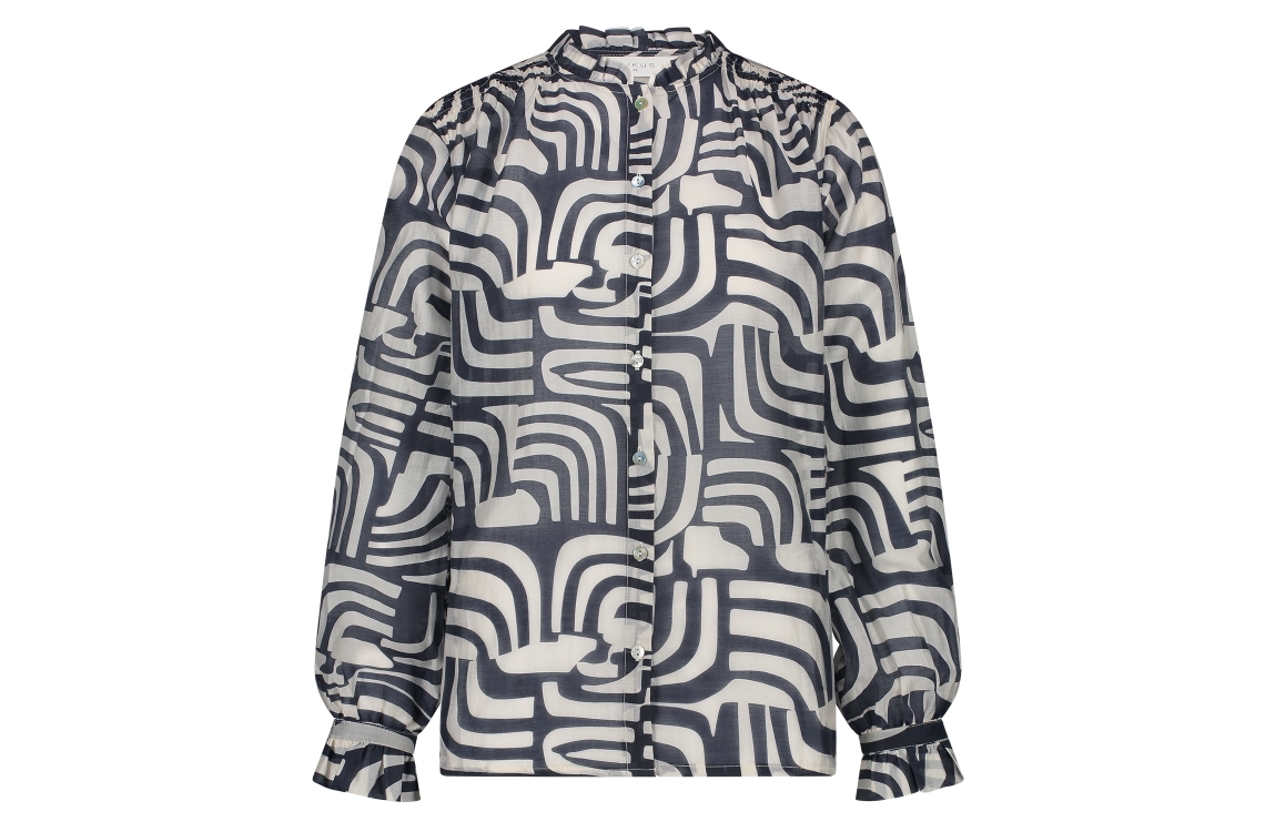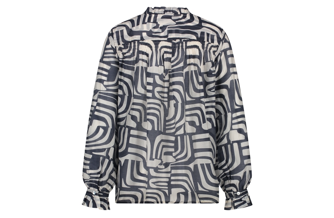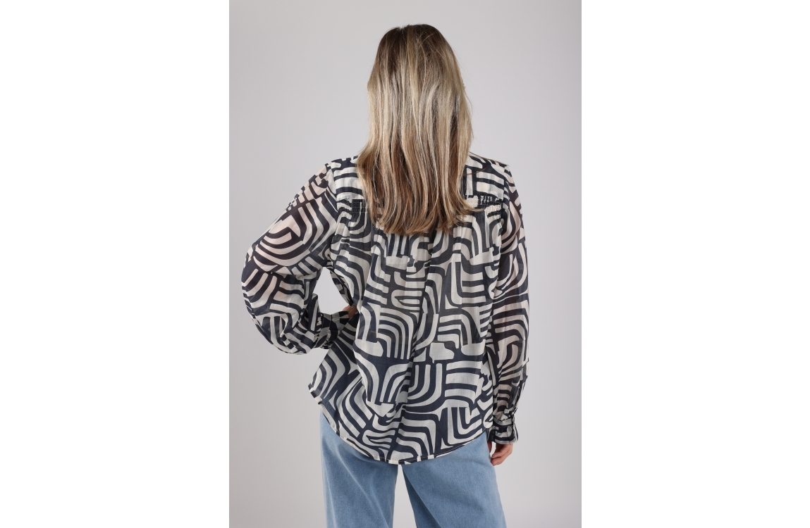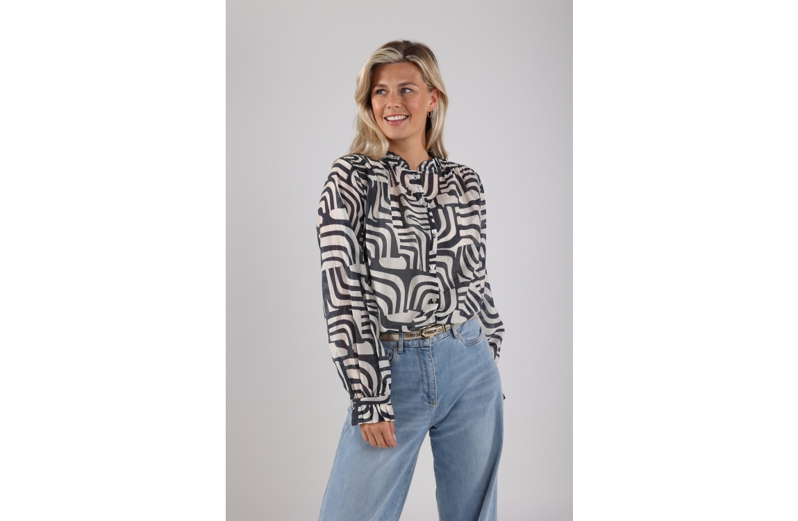 Nukus blouse Jenna nks02089. Dit rechtvallend model is voorzien van een ronde hals en heeft lange mouwen afgewerkt met ruches. Deze blauwe/grijze blouse van Nukus is bewerkt met een grafische print en sluit door middel van knopen. Dit model is semi-transparant uitgevoerd.