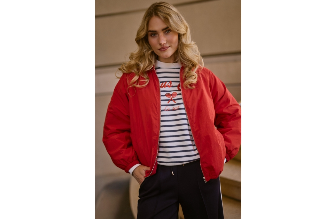 NUKUS Jenny Jacket 373 kiss. Dit bomber model is voorzien van een ronde hals en heeft lange mouwen. Deze rode bomber van Nukus sluit door middel van een rits.