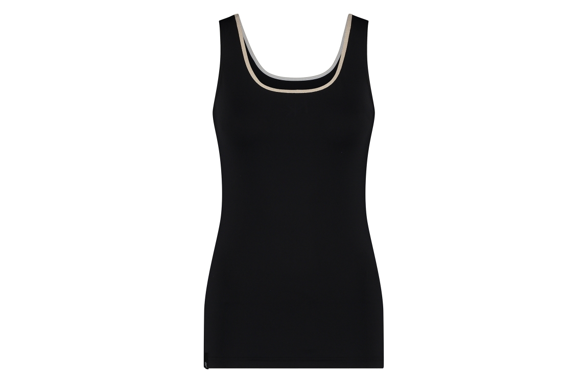 NUKUS Juba Singlet 169 black/gold. Dit aangesloten model is voorzien van een ronde hals met brede bandjes en is mouwloos. Deze zwarte singlet van Nukus is afgewerkt met een subtiel lurex randje.