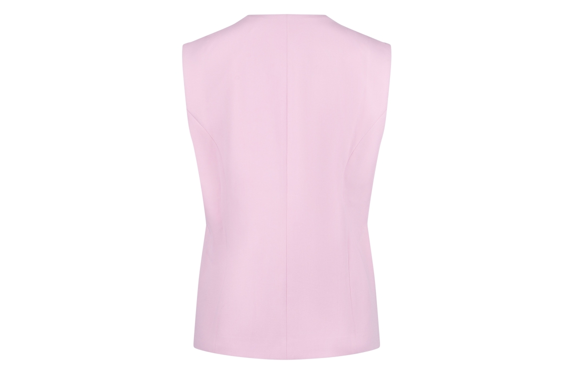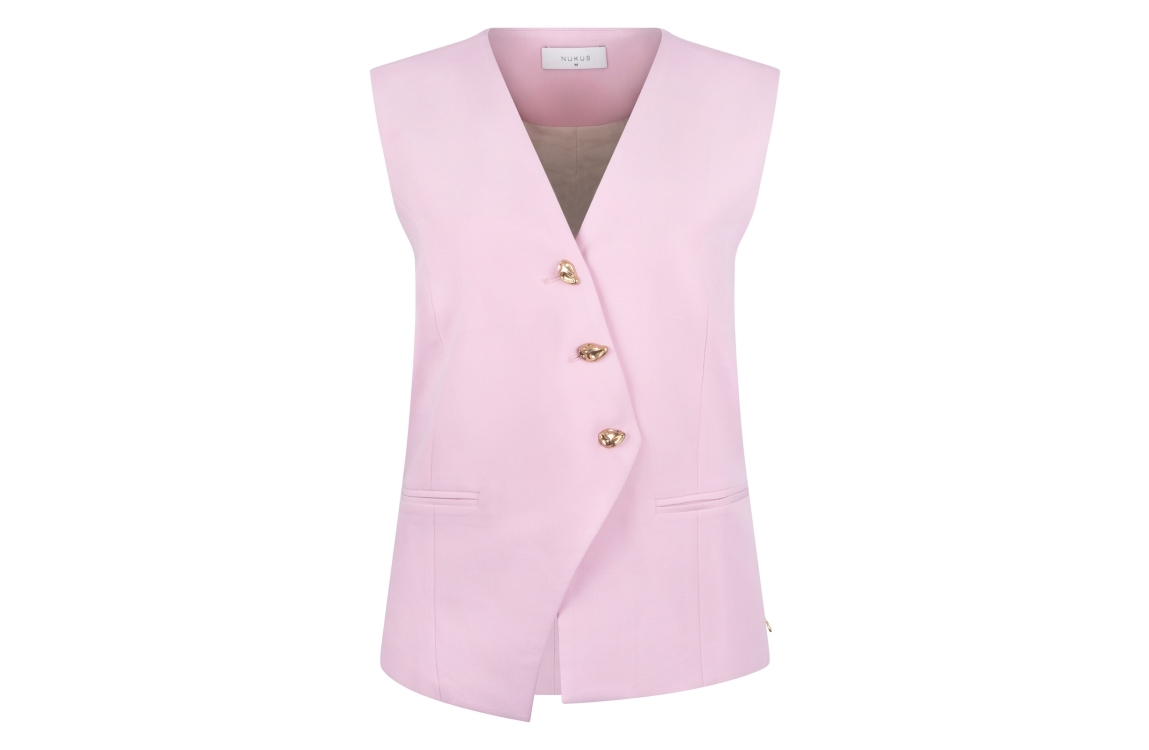 NUKUS Julia Gilet 30 blush. Dit rechtvallende model is voorzien van een v-hals en is mouwloos. Dit roze gilet van Nukus sluit door middel van goudkleurige knopen aan de voorzijde. Dit model is aan de voorzijde afgewerkt met paspelzakjes aan de voorzijde.