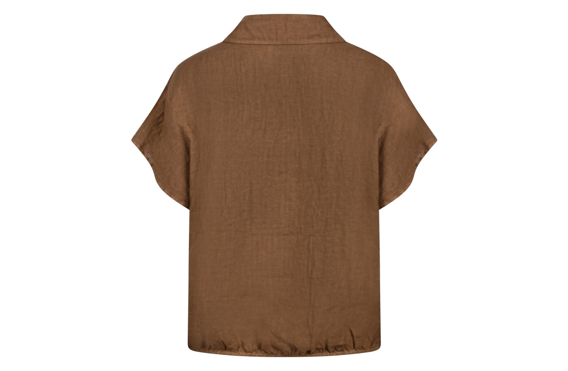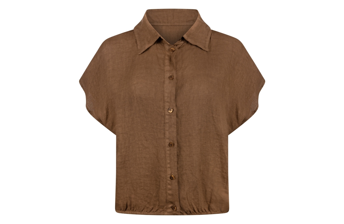 NUKUS shirt NKS01188 65. Het soepelvallende model heeft een kraag en korte, afgekapte mouwen. Dit bruine shirt van NUKUS sluit aan de voorzijde door middel van knopen en is afgewerkt met een elastische zoom.