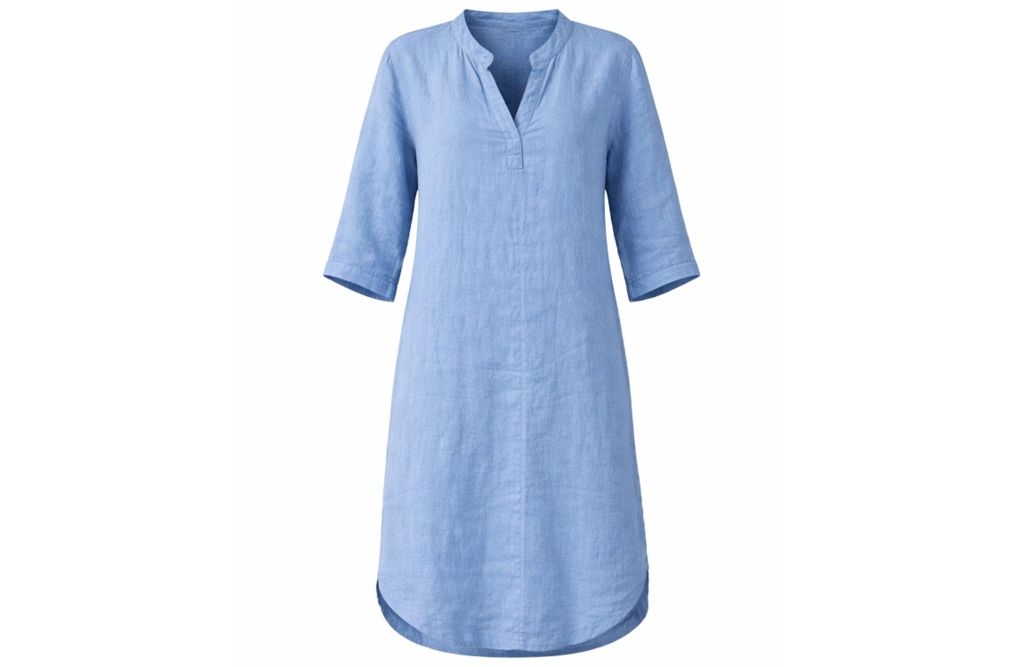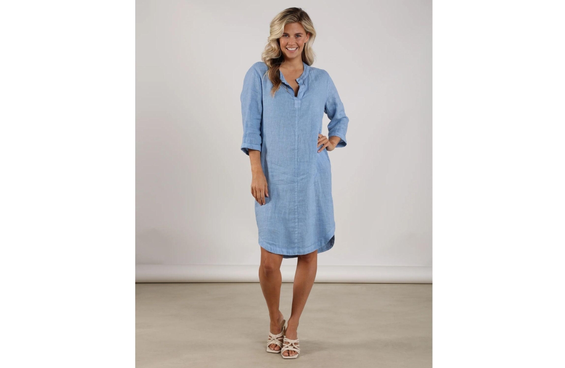 NUKUS Kate Dress Mix 312 cloudy. Dit rechtvallende model is voorzien van een v-hals en heeft driekwart mouwen. Deze blauwe jurk van Nukus is luchtig en ademend.