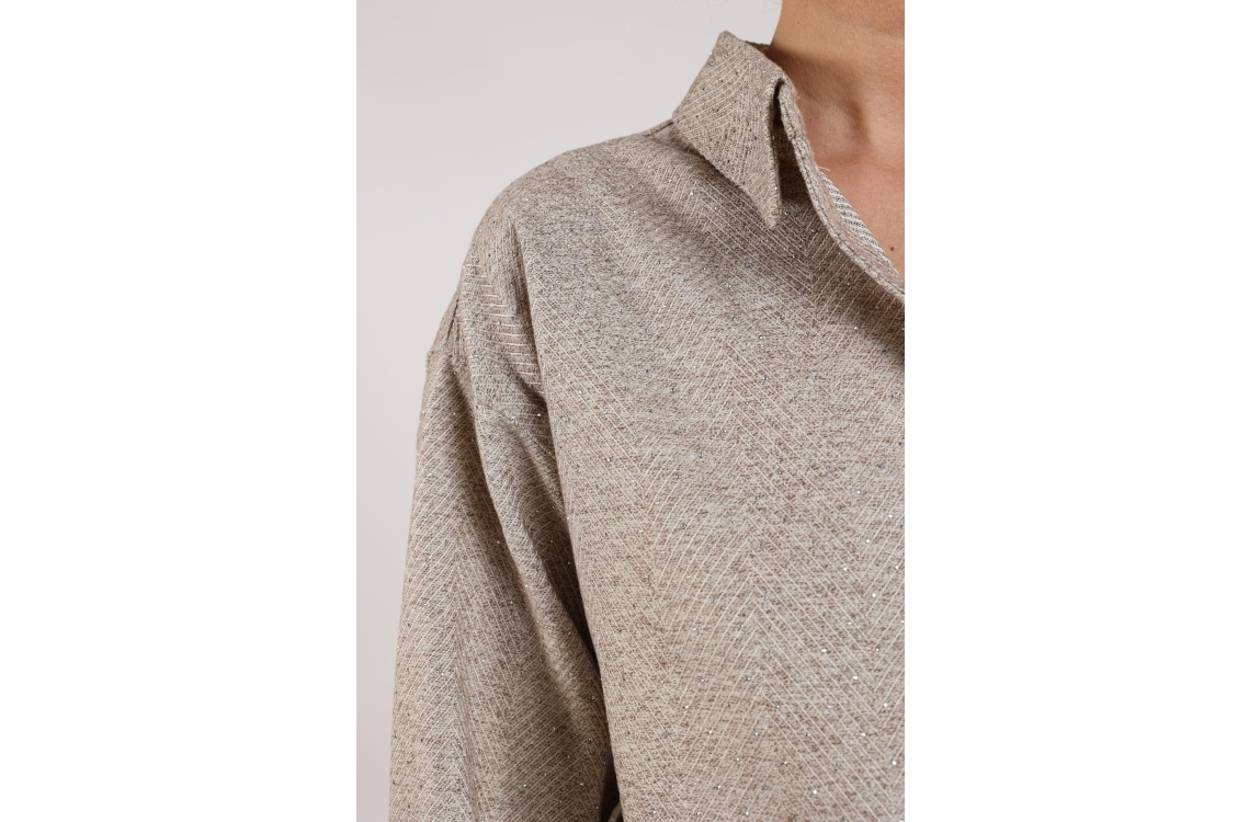 NUKUS Lara Blouse Strass 9 sand. Dit rechtvallend model is voorzien van een kraag en heeft lange mouwen. Deze zandkleurige jacket van Nukus sluit door middel van knopen en is bewerkt met strass-steentjes. Dit model is onderdeel van een co-ord set.