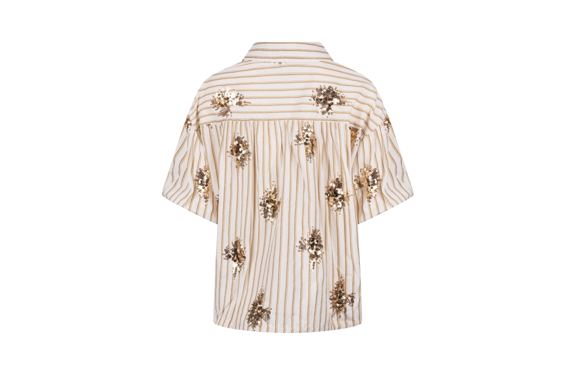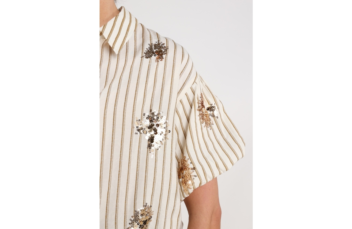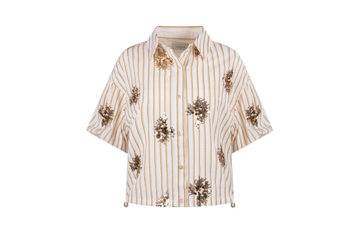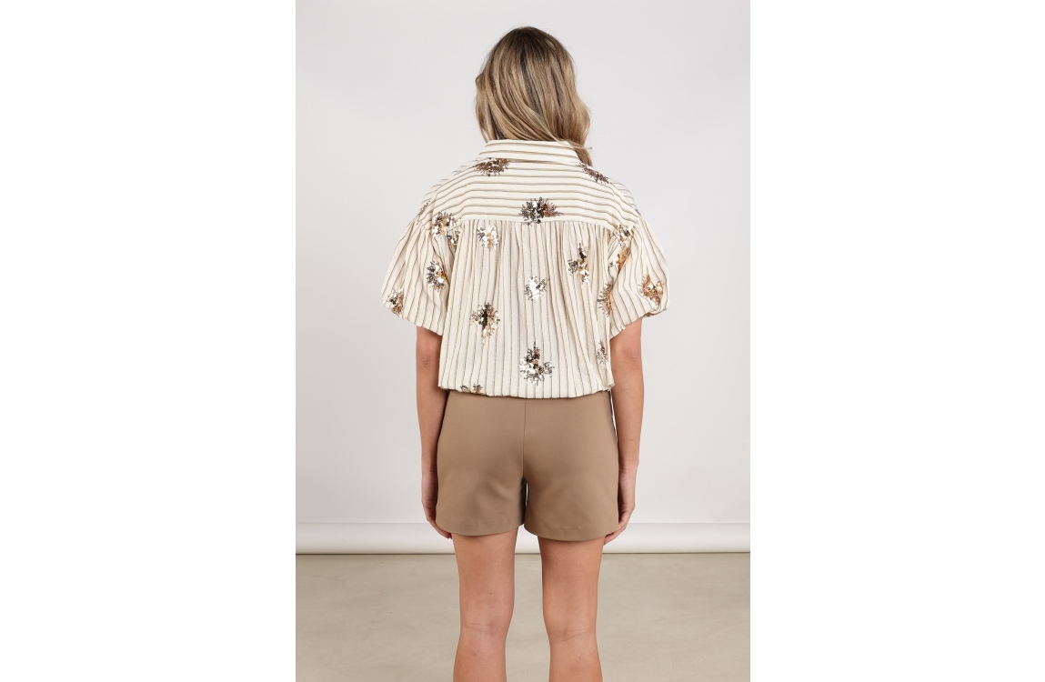NUKUS Leia Blouse Stripe Paillet 143 offwhite/fango. Dit rechtvallende model is voorzien van een kraag en heeft korte pofmouwen. Deze off-white blouse van Nukus sluit door middel van knopen en is bewerkt met een subtiele glitter streeppatroon in het bruin. Aan de onderkant van de blouse zit elastiek die verstelbaar is.