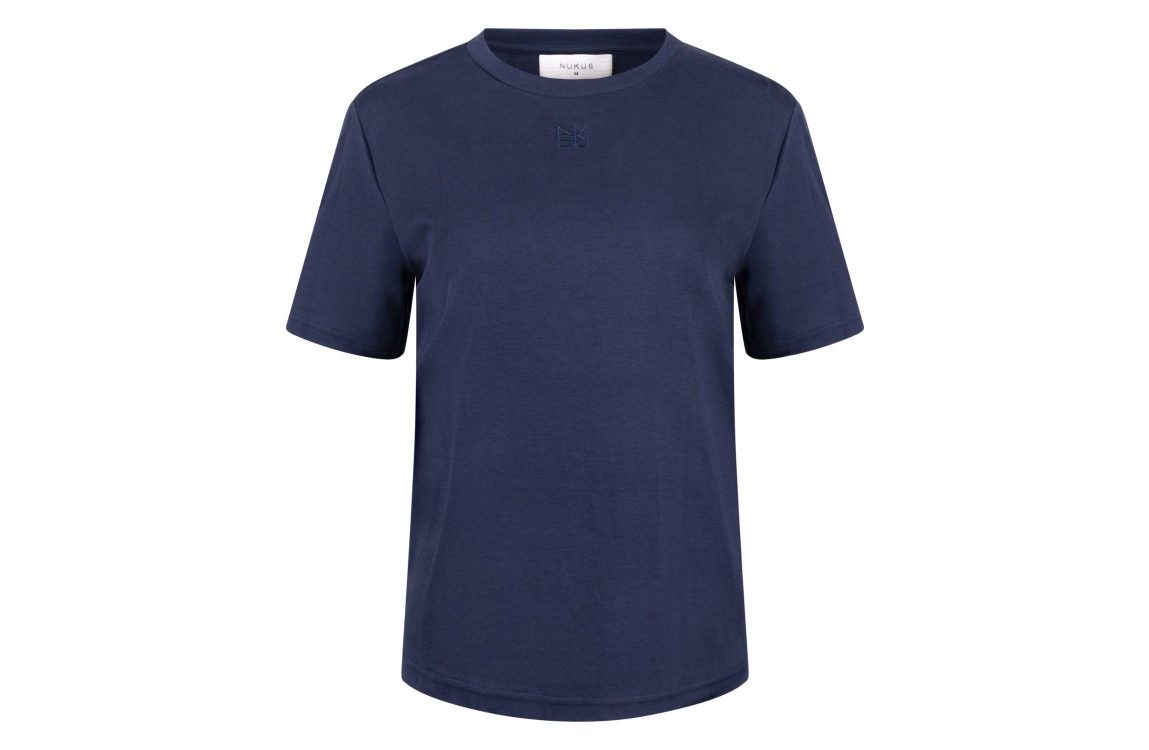 NUKUS Luna Shirt 70 navy. Dit rechtvallende model is voorzien van een ronde hals en heeft korte mouwen. Dit donker blauwe shirt van Nukus is in het midden op de borst bewerkt met het logo.