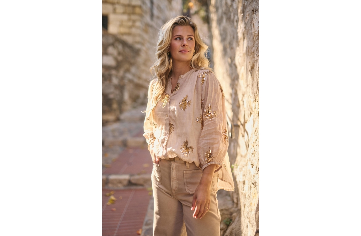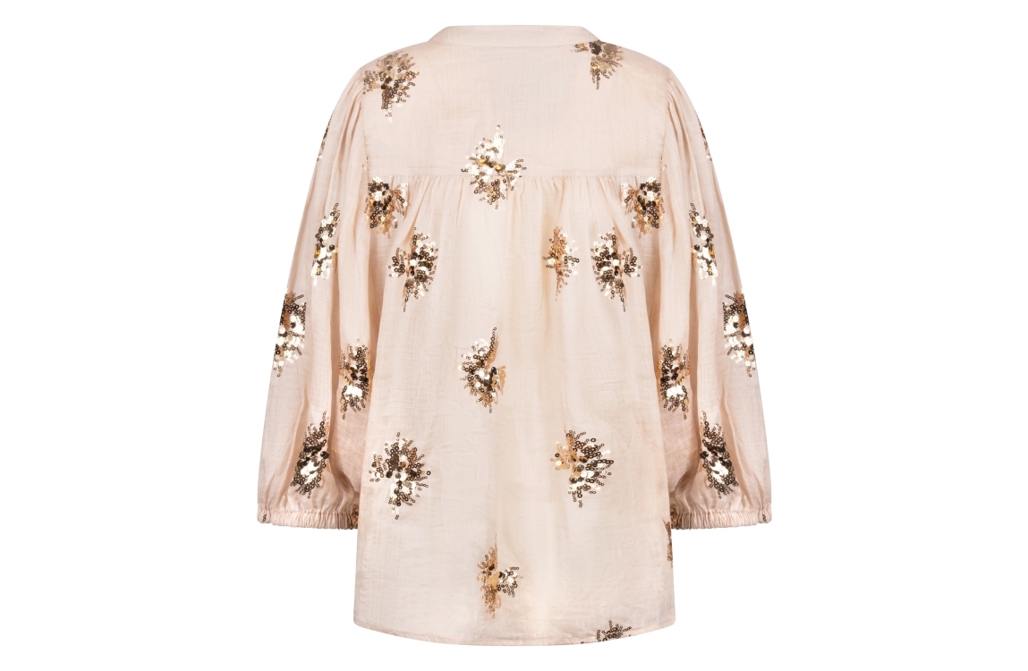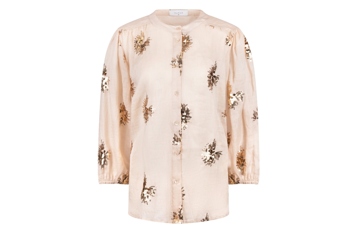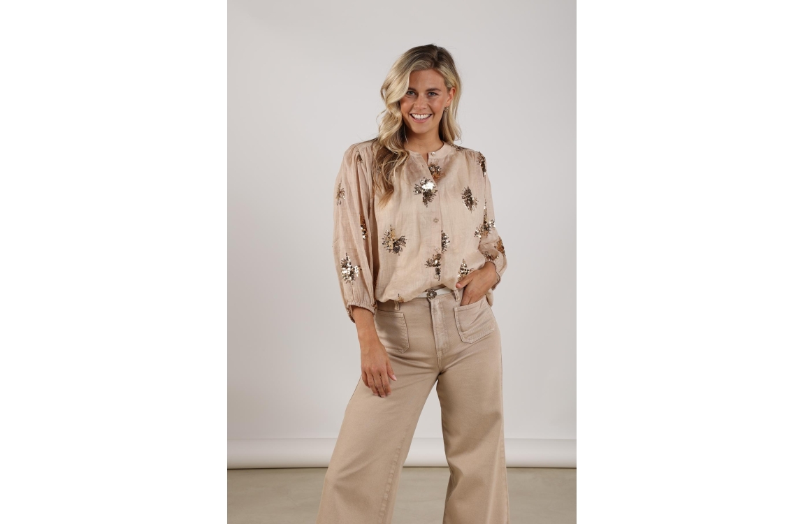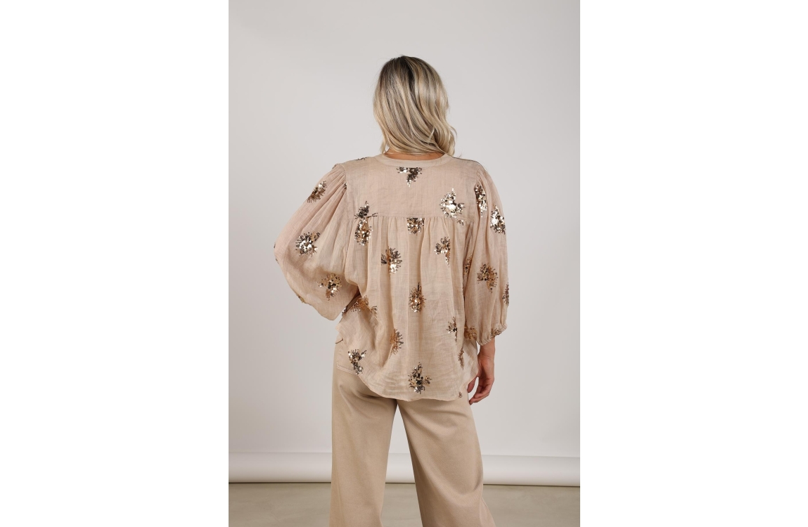 NUKUS Lynn Blouse Paillet 239 sand/gold. Dit rechtvallende model is voorzien van een ronde hals en driekwart mouwen. Deze licht bruine blouse van Nukus sluit door middel van knopen en is bewerkt met glitters/pailletten over de stof.