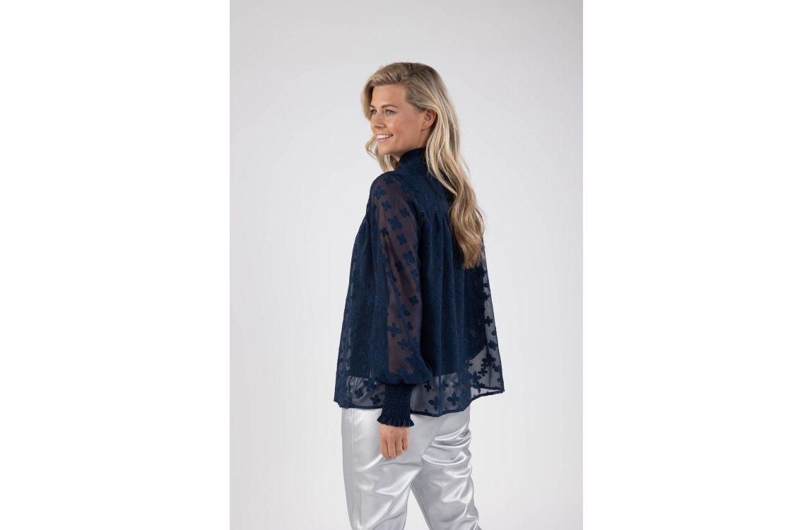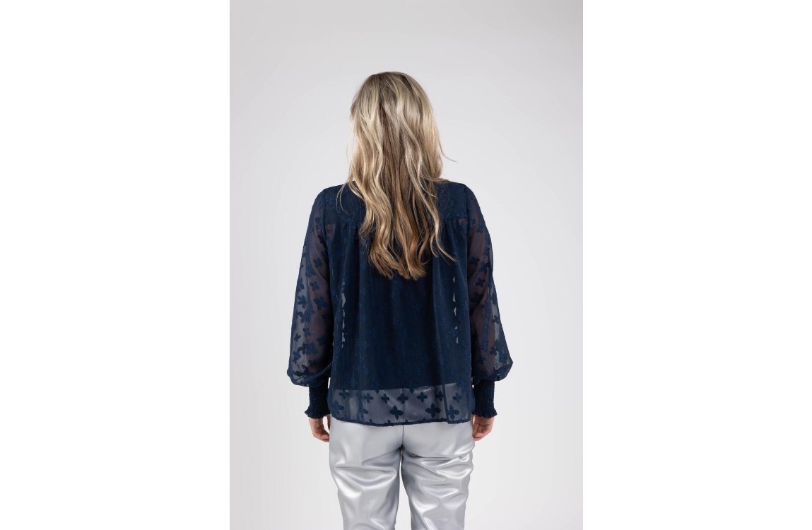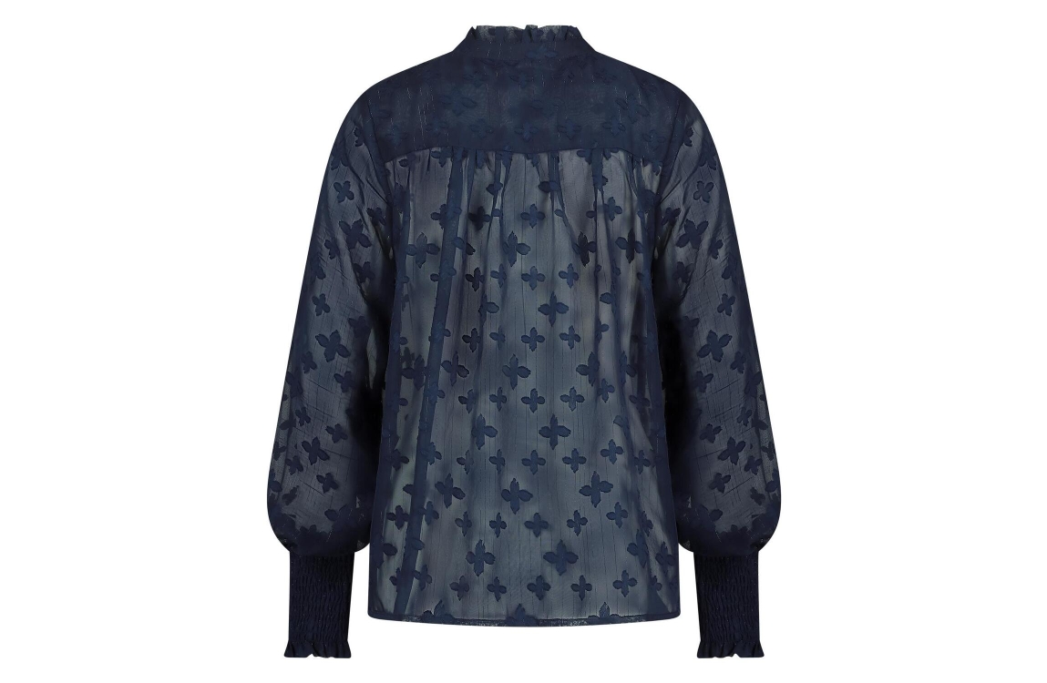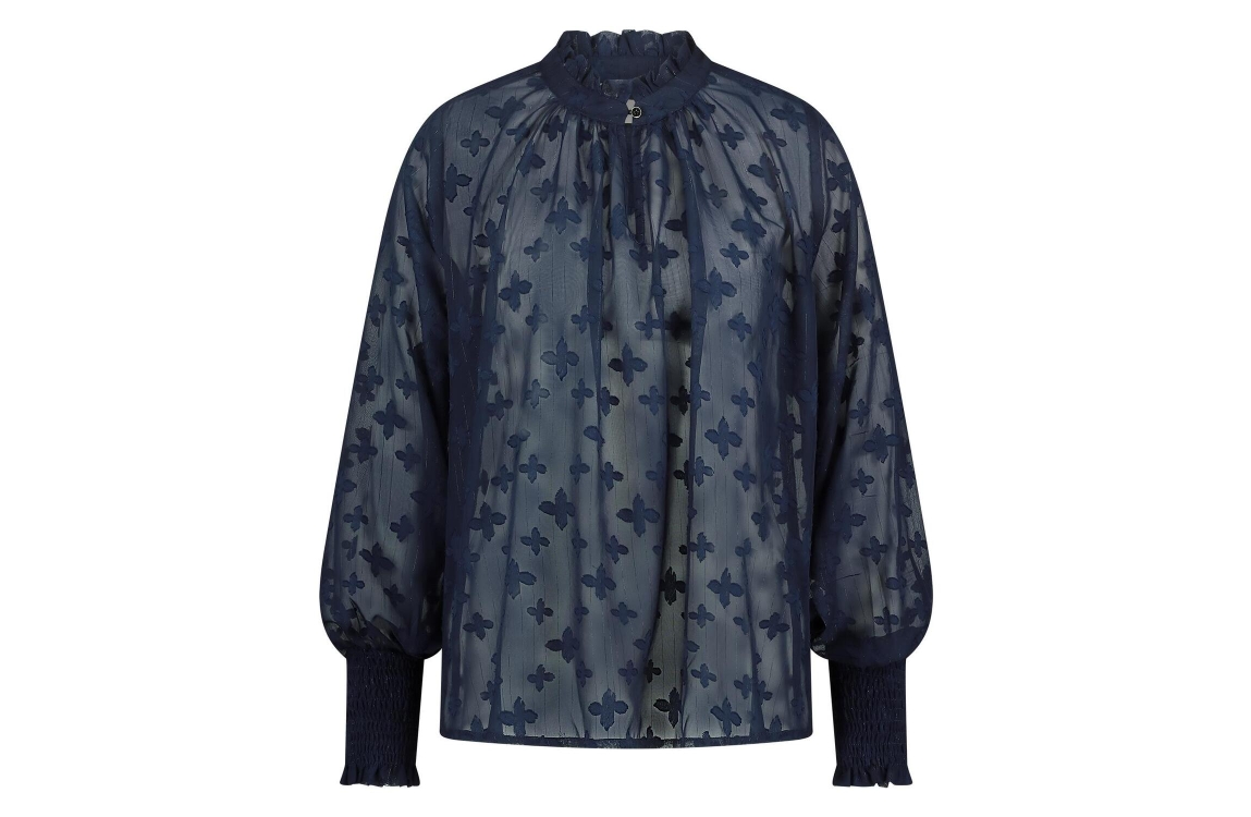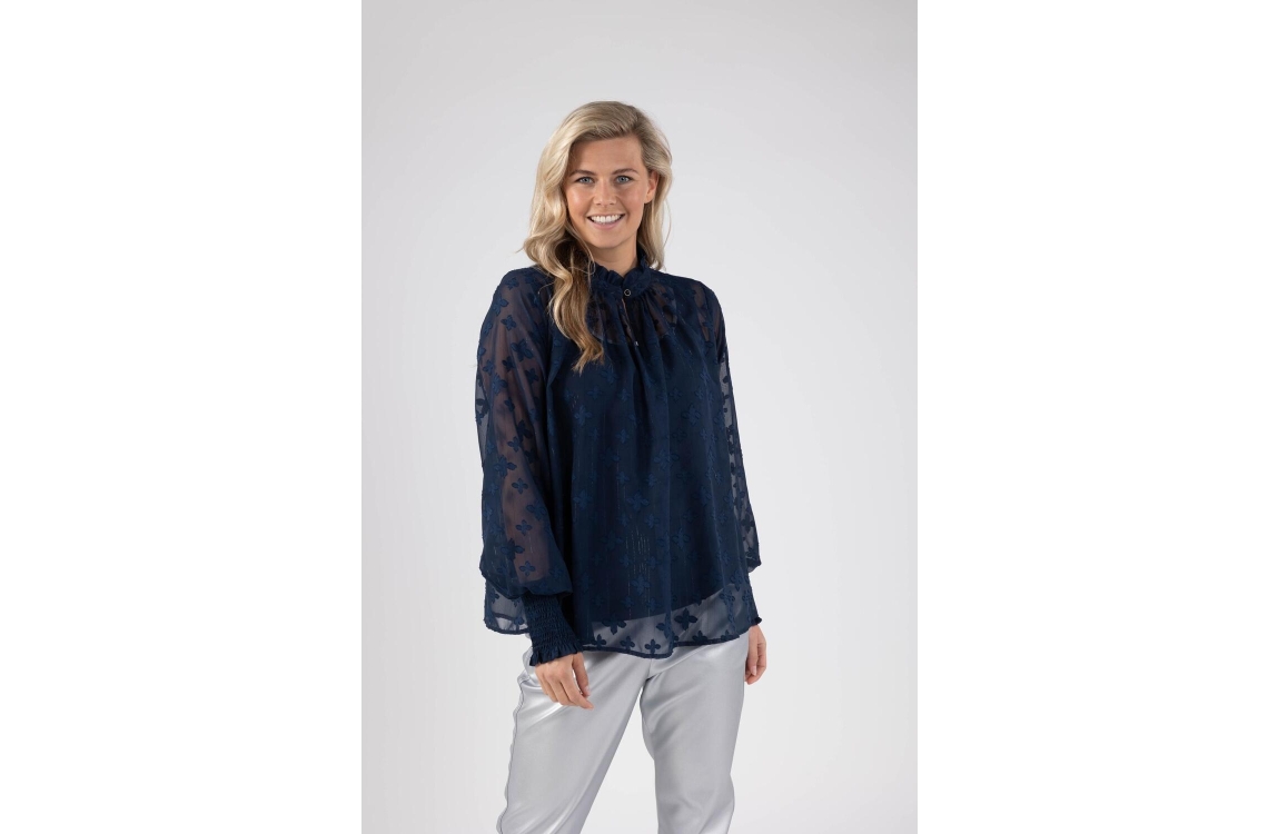Nukus blouse Marbella Flower FW240467. Dit rechtvallend model heeft een ronde hals met ruches en lange mouwen. Deze donkerblauwe blouse van Nukus heeft een all-over bloemenprint en is semi-transparant uitgevoerd. Dit model sluit bij de hals door middel van een decoratieve knoop en beschikt over elastiek op de polsen.