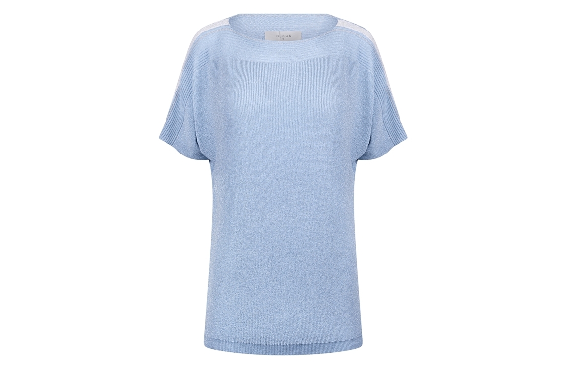 NUKUS Merla Top Lurex 312 cloudy. Dit rechtvallende model is voorzien van een boothals en heeft korte mouwen. Deze blauwe top van Nukus is bewerkt met een subtiele glans en lurex.